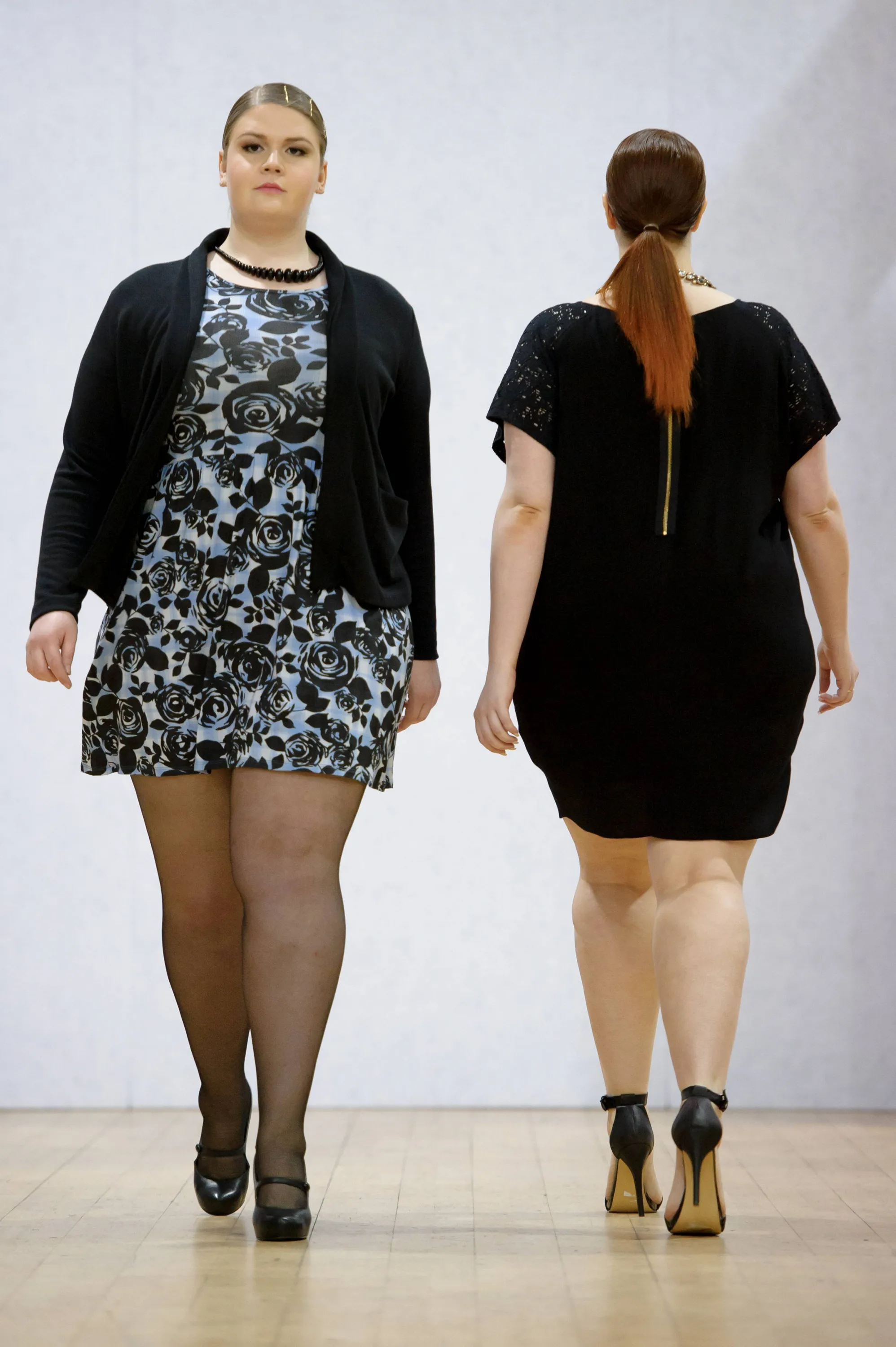 Models wear a design created by Plus Size Fashion during London Fashion Week Autumn/Winter 2014, at Vinopolis in central London, Friday, February 14, 2014. (Photo by Jonathan Short/AP Photo)