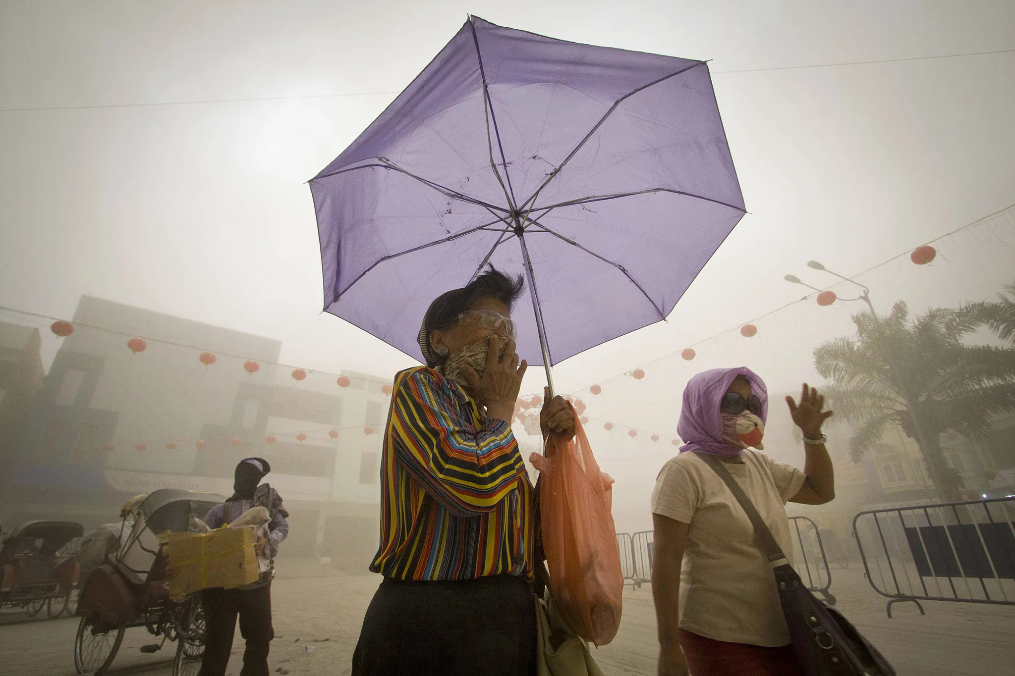 Villagers covering their faces from volcanic ash follwoing Mount Kelud's eruption in Solo, Indonesia, Friday, February 14, 2014. The major volcanic eruption shrouded a large swath of the country's most heavily populated island in ash on Friday, triggering the evacuation of more than 100,000 people and the closure of three international airports after killing two people. (Photo by Hafidz Novalsyah/AP Photo)