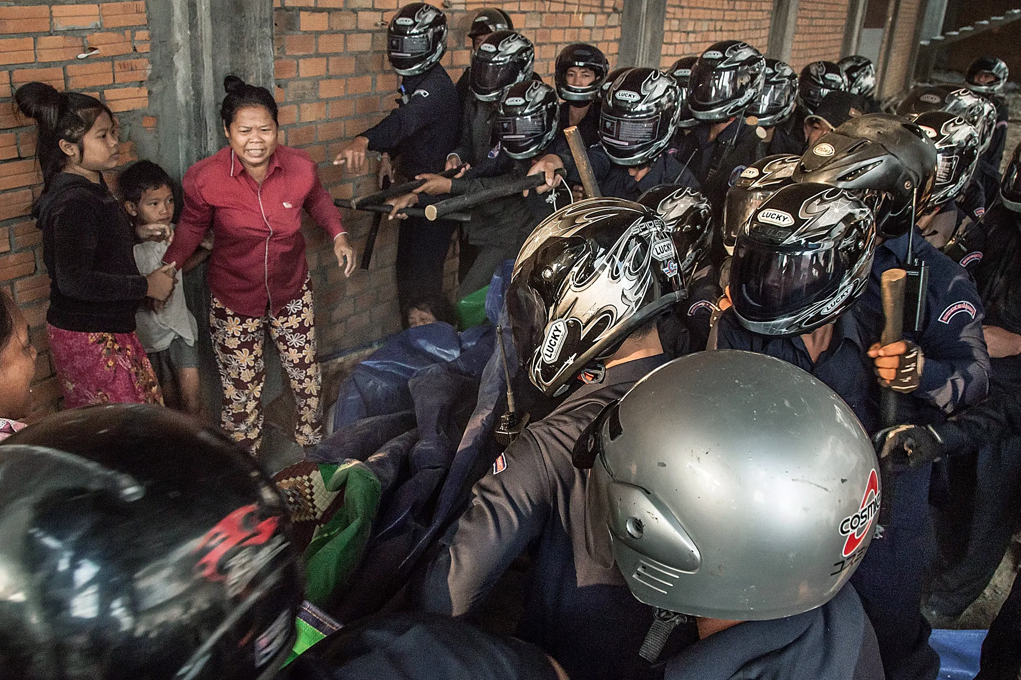 A woman and two children are surrounded by police and municipal security forces during clashes with residents of Borei Keila community on February 14, 2014 in Phnom Penh, Cambodia. A building which has been occupied for the last two days has been raided by the Cambodian Security forces who sought to forcibly evict the residents. . Early on the morning of Valentine's Day, the road leading into Borei Keila was blocked by riot police, military police, and municipal security guards, who had been deployed to remove all of the families which had occupied the building. Over the course of the violent eviction, at least 6 people were injured, including a woman who was 6 months pregnant. Two days before, on Wednesday, more than 150 people, who had been evicted from their former homes in Borei Keila in January 2012, had moved into the building. The housing building had been promised to them in 2003, as part of a land sharing agreement when the land of Borei Keila had been leased to a private company. The families who had chosen to stay in Borei Keila were violently evicted in 2012 by over 100 security forces, who destroyed more than 200 homes. (Photo by Omar Havana/Getty Images)