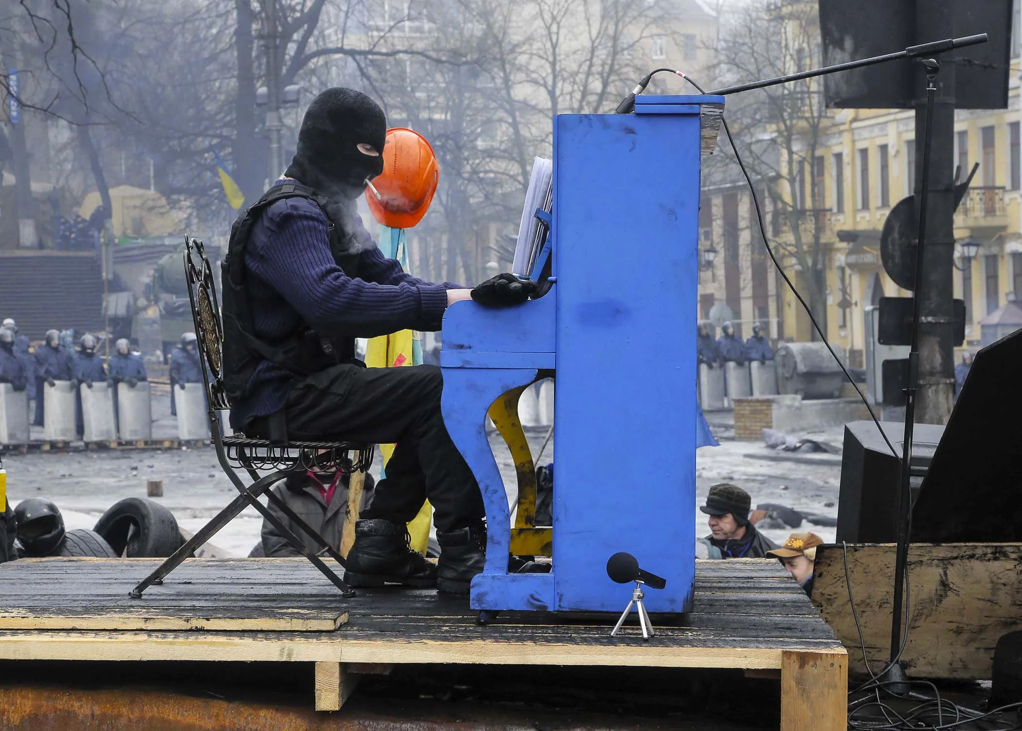 An opposition supporter plays the piano on barricades in front of riot police in central Kiev, Ukraine, on February 10, 2014. The country has been rocked by nearly three months of anti-government protests sparked by President Viktor Yanukovich's refusal to sign a wide-ranging trade agreement with the European Union. (Photo by Efrem Lukatsky/Associated Press)