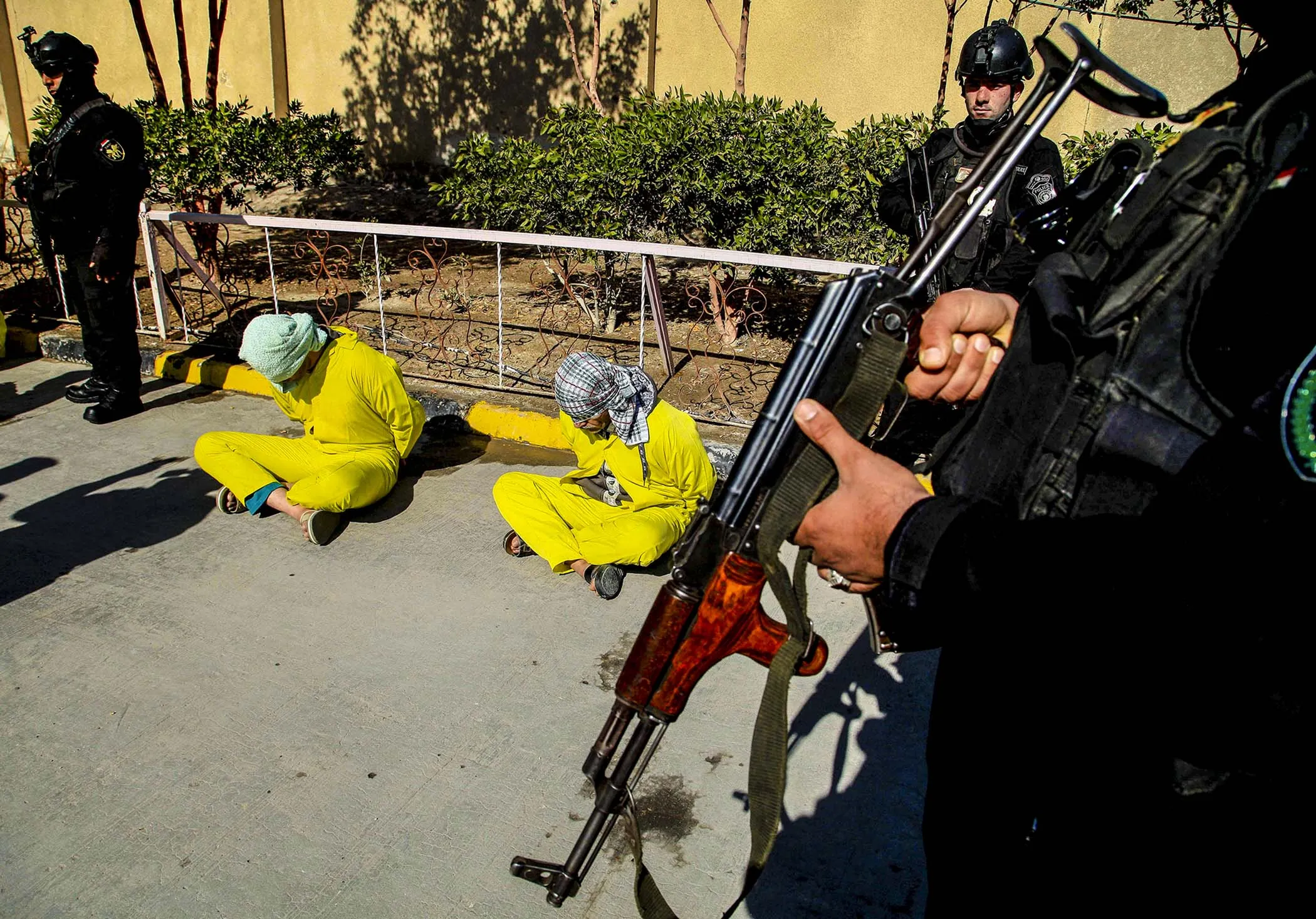 Members of Iraq's Special Weapons and Tactics Team ) stand guard over blindfolded suspected members of the al-Qaida-linked Islamic State of Iraq and the Levant at the federal police headquarters in Basra, on February 11, 2014. Security forces arrested 14 suspected al-Qaida members during recent security operations in Basra. (Photo by Nabil al-Jurani/Associated Press)