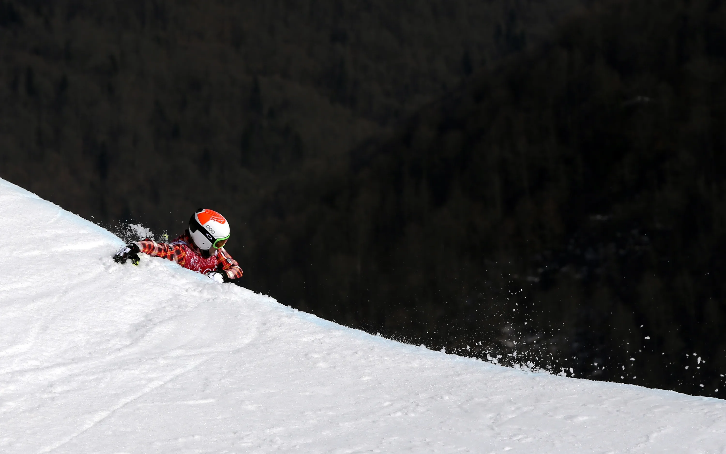 Canada's Brady Leman falls off a jump after crashing in the men's ski cross final at the Rosa Khutor Extreme Park at the 2014 Winter Olympics, Thursday, February 20, 2014, in Krasnaya Polyana, Russia. (Photo by Sergei Grits/AP Photo)