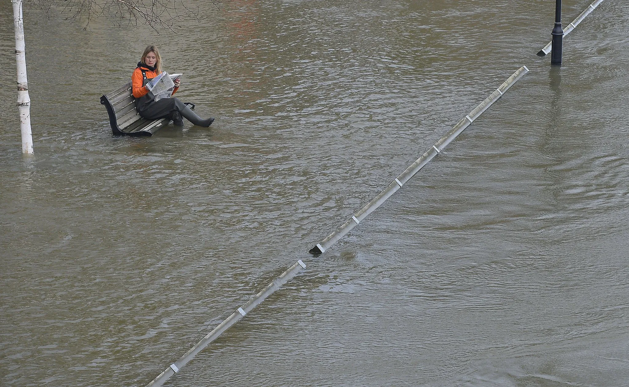 A woman sits on a bench on a flooded Thames riverside path in Staines, southern England February 17, 2014. Engulfing towns and countryside, floods have triggered the biggest rescue operation in Britain since World War Two. Tens of thousands have been left without power, others evacuated from their homes after the wettest January on record pushed river banks to breaking point. There is now concern that the unrelenting bad weather could be severe enough to dent Britain's economic recovery. (Photo by Toby Melville/Reuters)
