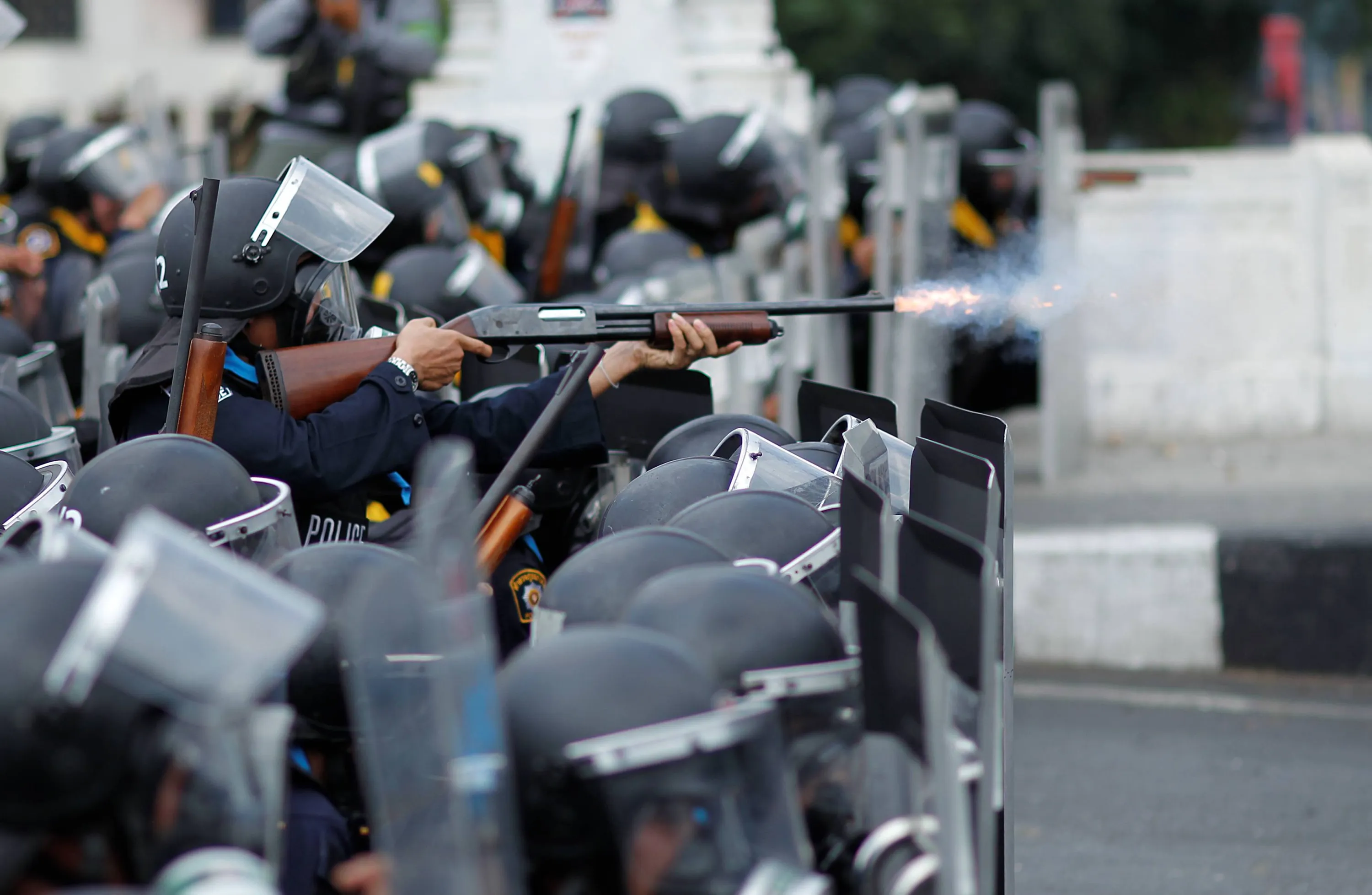 Riot police fire rubber bullets into the crowds of anti-government protesters during a clash in Bangkok, Thailand, Tuesday, February 18, 2014. Emergency medical officials say that one civilian was killed and 50 people were injured in clashes between Thai police and anti-government protesters in Bangkok. (Photo by Wally Santana/AP Photo)