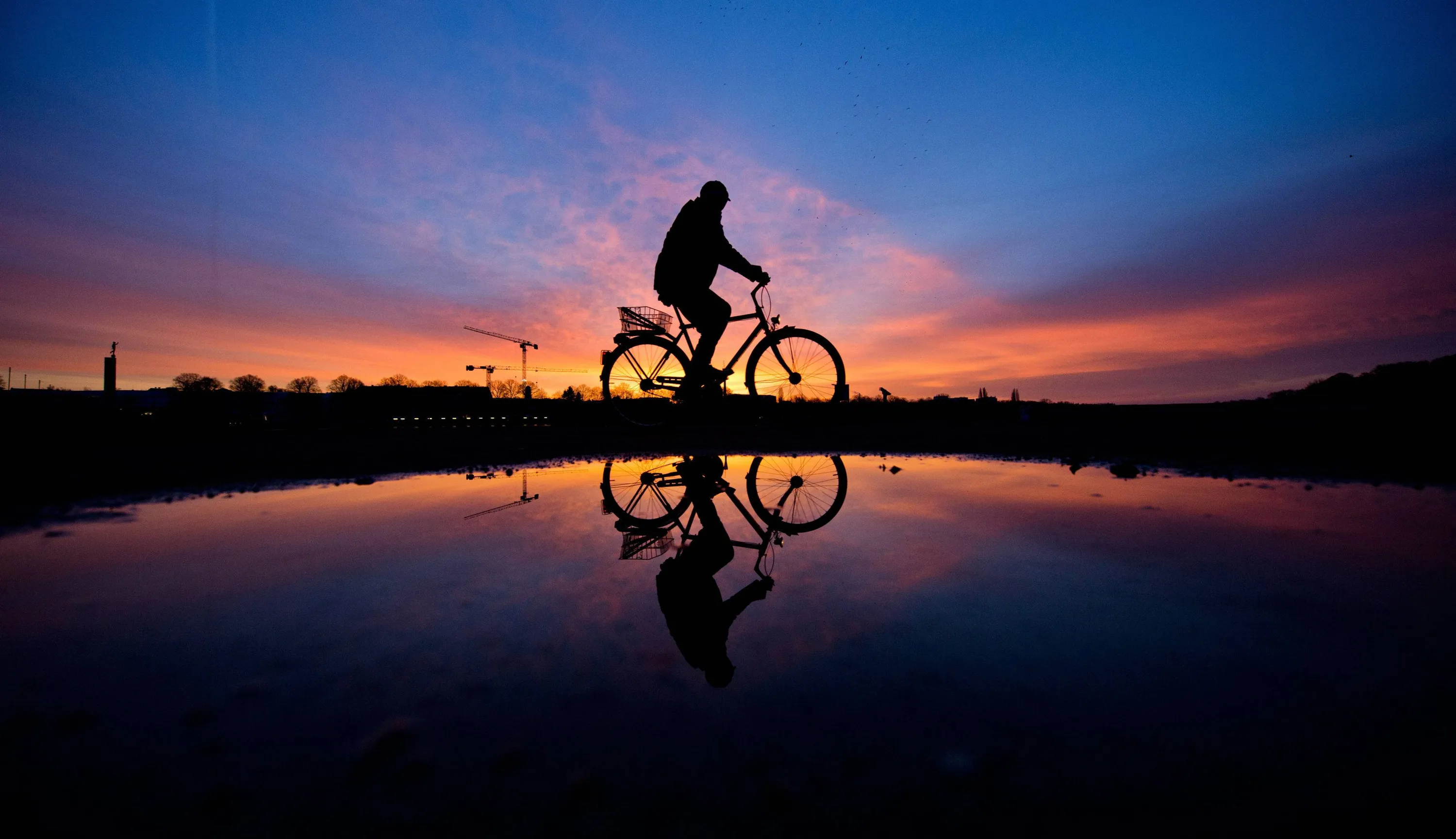 A cyclist is silhouetted against the rising sun and reflected in a puddle in Hannover, northern Germany, Tuesday, February 18, 2014. (Photo by Julian Stratenschulte/AP Photo/DPA)