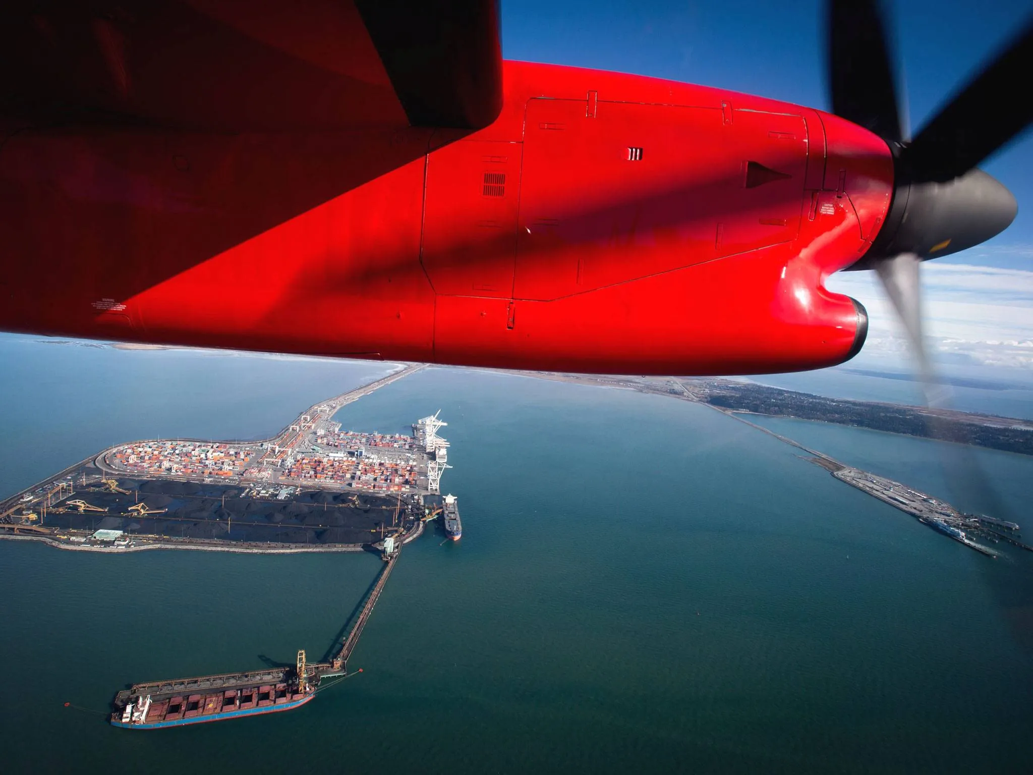 A National Aerial Surveillance Program flight flies over Deltaport as a ship is loaded with coal at Westshore Terminals in Delta, British Columbia, on Wednesday, February 19, 2014. (Photo by Darryl Dyck/AP Photo/The Canadian Press)