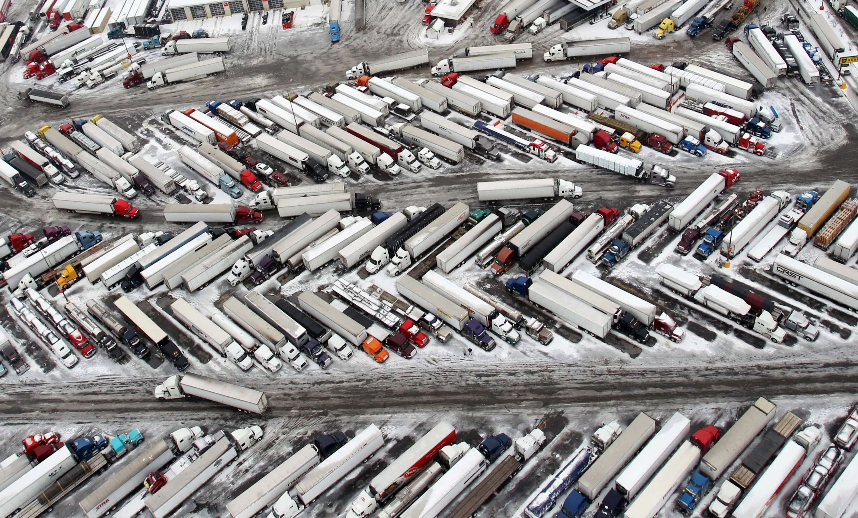 In this aerial photo taken on March 3, 2014, semitrailers fill up a truck stops in West Memphis, Ark. Some motorists on the highway in eastern Arkansas were stranded overnight due to lingering icy conditions from a weekend winter storm. An Arkansas highway department spokesman said Tuesday that traffic can't get moving consistently because of repeated accidents. (Photo by Mike Brown/AP Photo/The Commercial Appeal)