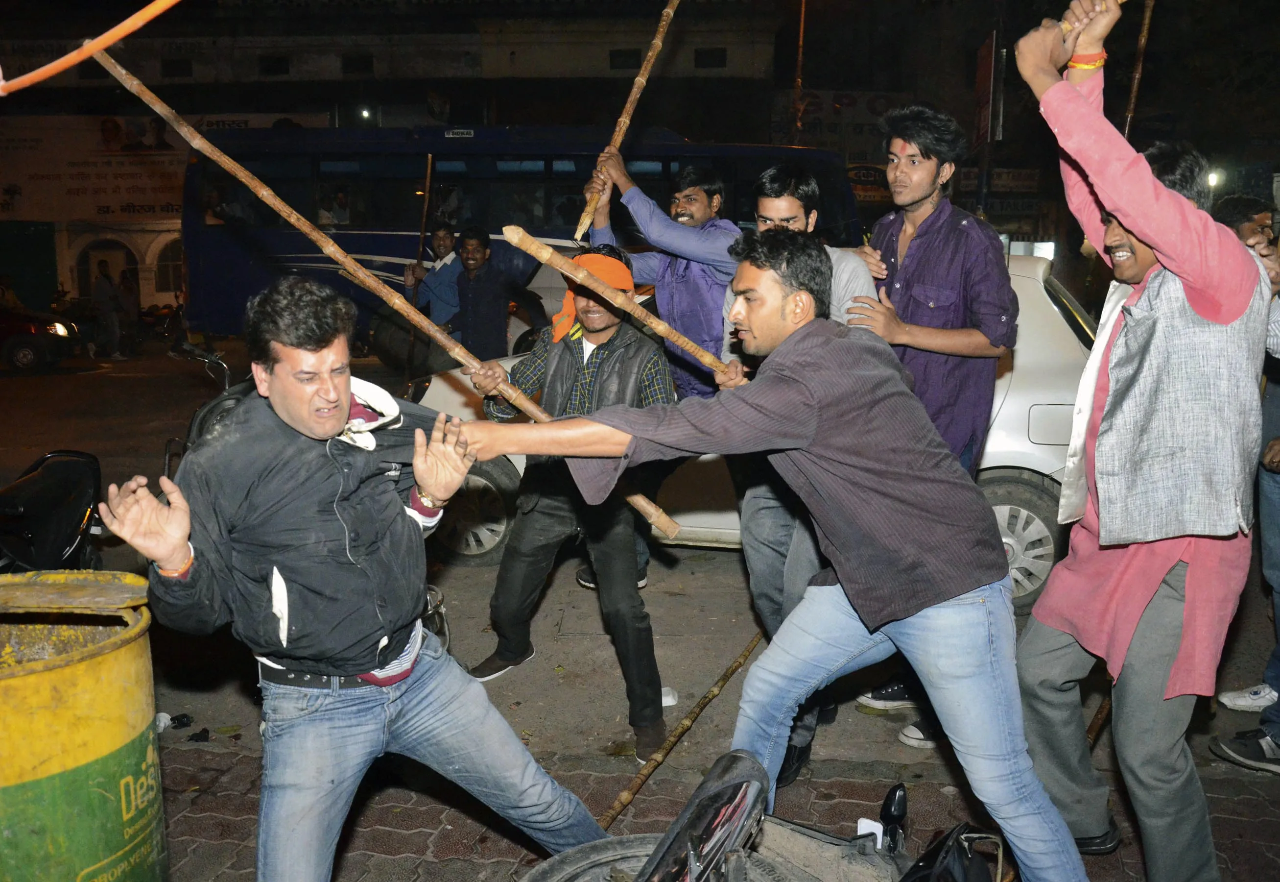 Supporters of Aam Aadmi (Common Man) Party (AAP) and India's main opposition Bharatiya Janata Party (BJP) clash during a protest outside the office of BJP in the northern Indian city of Lucknow March 5, 2014. Street clashes marred an announcement on Wednesday that India's general election will start on April 7 as passions run high in a race that pits Hindu nationalist Narendra Modi against the unpopular Nehru-Gandhi family's ruling party. (Photo by Reuters/Stringer)