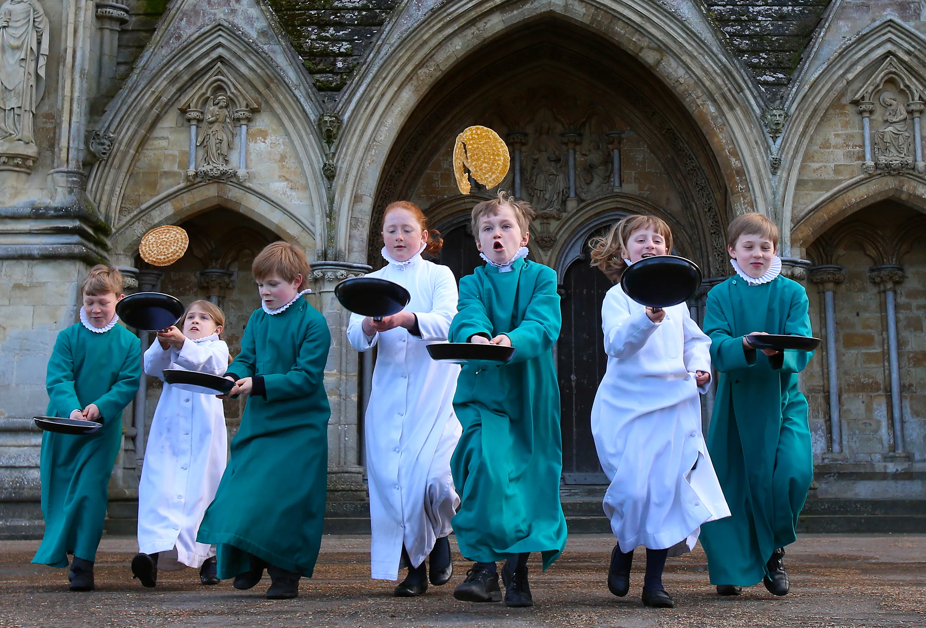 Young probationers, the trainee choristers of Salisbury Cathedral Choir, flip pancakes to mark Shrove Tuesday outside the West Front of the 13th century Cathedral on March 4, 2014 in Salisbury, England. Every year the choristers make breakfast pancakes at the Canon Precentor’s house to learn about the meaning of Shrove Tuesday, which is traditionally the day that all fats and flesh are eaten up to prepare for the forty days fast of Lent. (Photo by Matt Cardy/Getty Images)