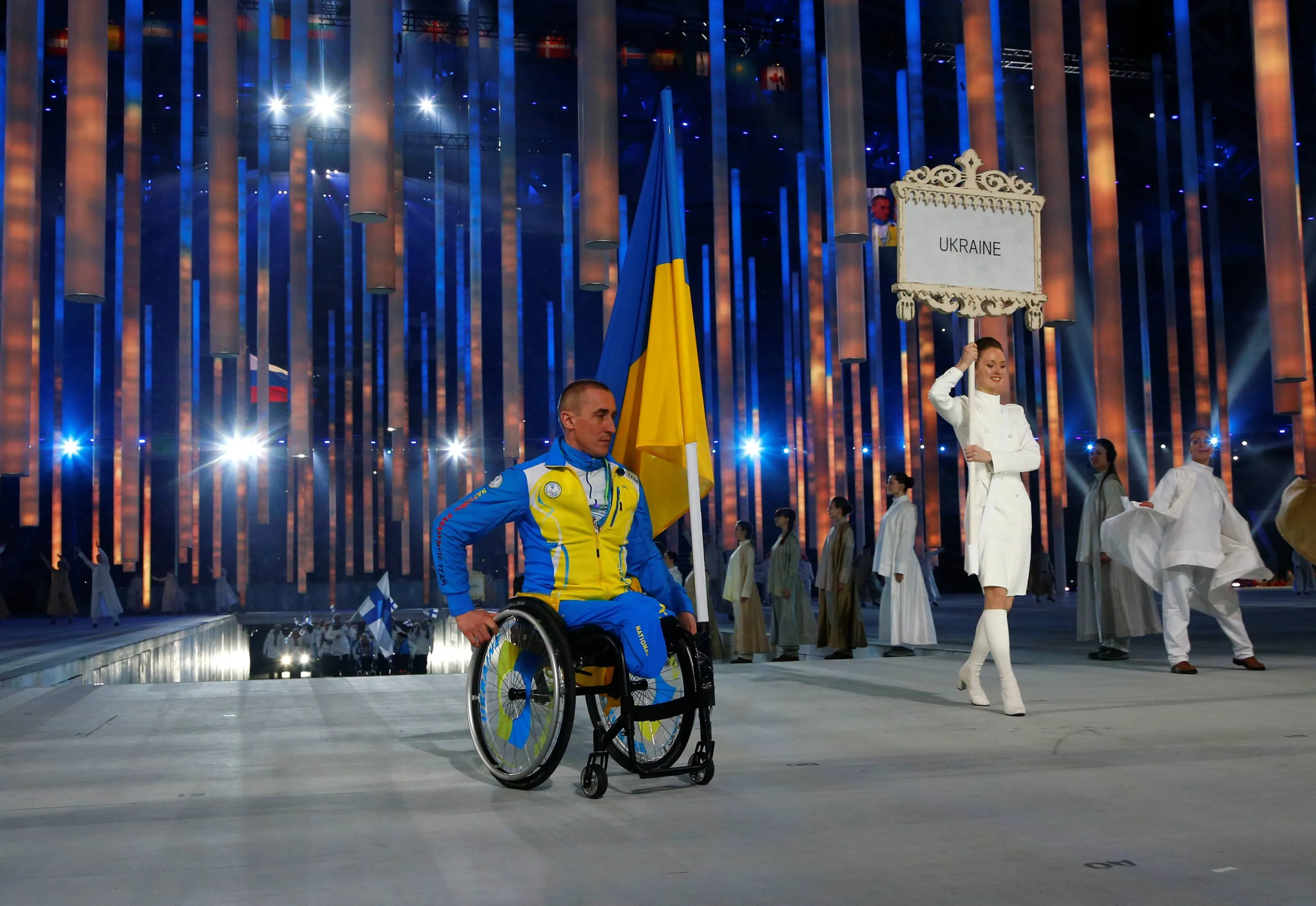 Biathlete Mykhaylo Tkachenko, representing Ukraine, enters the arena during the opening ceremony of the 2014 Winter Paralympics at the Fisht Olympic stadium in Sochi, Russia, Friday, March 7, 2014. (Photo by Dmitry Lovetsky/AP Photo)