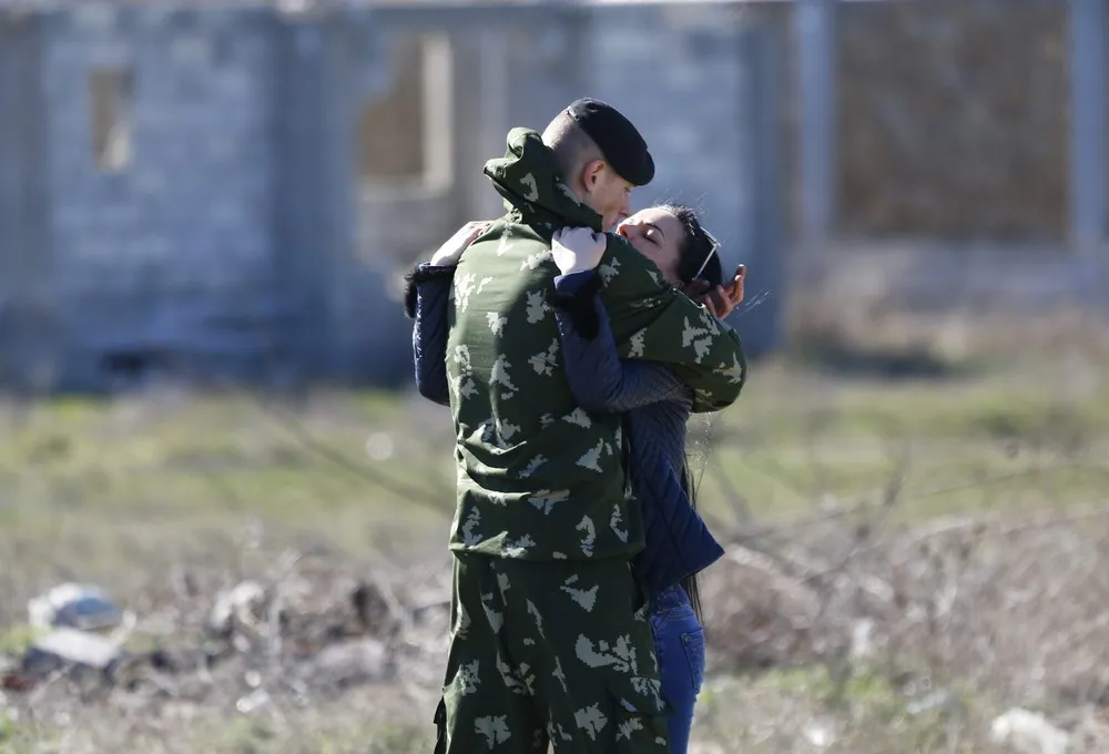 A woman hugs a Ukrainian marine in front of a Ukrainian marine base in the Crimean port city of Feodosia, March 23, 2014. Russia's defence ministry said on Sunday that it was complying with international troop limits near its border with Ukraine, after NATO's top military commander voiced concern over what he said was a large Russian force on Ukraine's eastern border. (Photo by Shamil Zhumatov/Reuters)