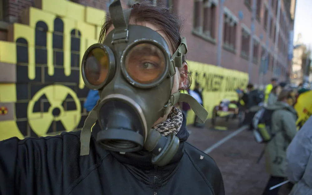 A demonstrator wears a gas mask as he gathers to protest against the Nuclear Industry Summit, which is taking place on the sidelines of the Nuclear Security summit (NSS), in Amsterdam March 24, 2014. The Nuclear Security Summit on March 24-25, aimed at preventing nuclear terrorism, will bring together several world leaders. (Photo by Cris Toala Olivares/Reuters)