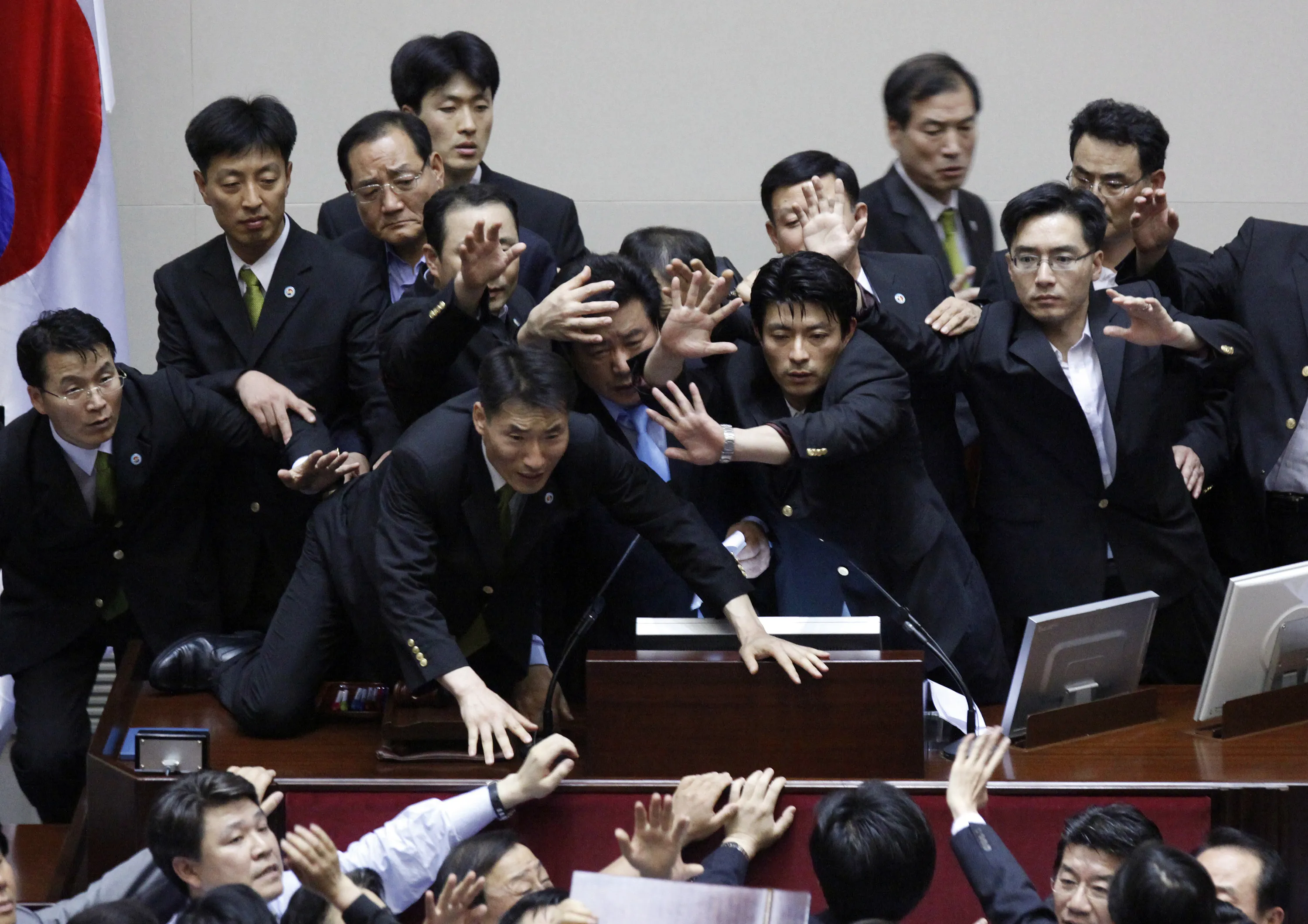 Lee Yoon-sung (C), vice speaker of the National Assembly and a lawmaker of the ruling Grand National Party, is surrounded by security guards as he passes new bills at the National Assembly main chamber in Seoul July 22, 2009. (Photo by Jo Yong-Hak/Reuters)