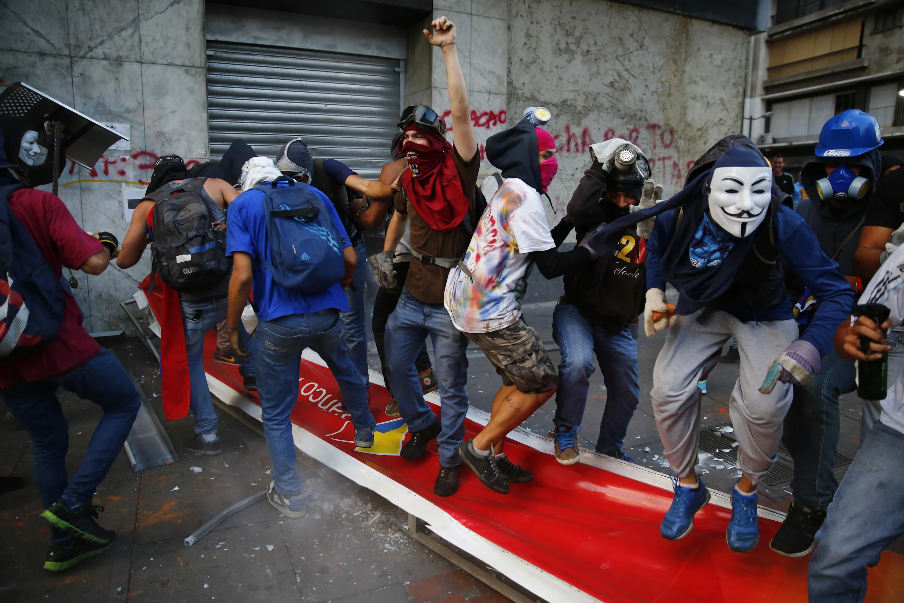 Anti-government protesters jump and step on a banner of Banco de Venezuela after bringing down the banner during riots in Caracas April 20, 2014. Masked youths battled police, protesters burned and hung from lamp-posts effigies of President Nicolas Maduro and marchers demanded the “resurrection” of democracy on a volatile Easter Sunday in Venezuela. (Photo by Jorge Silva/Reuters)