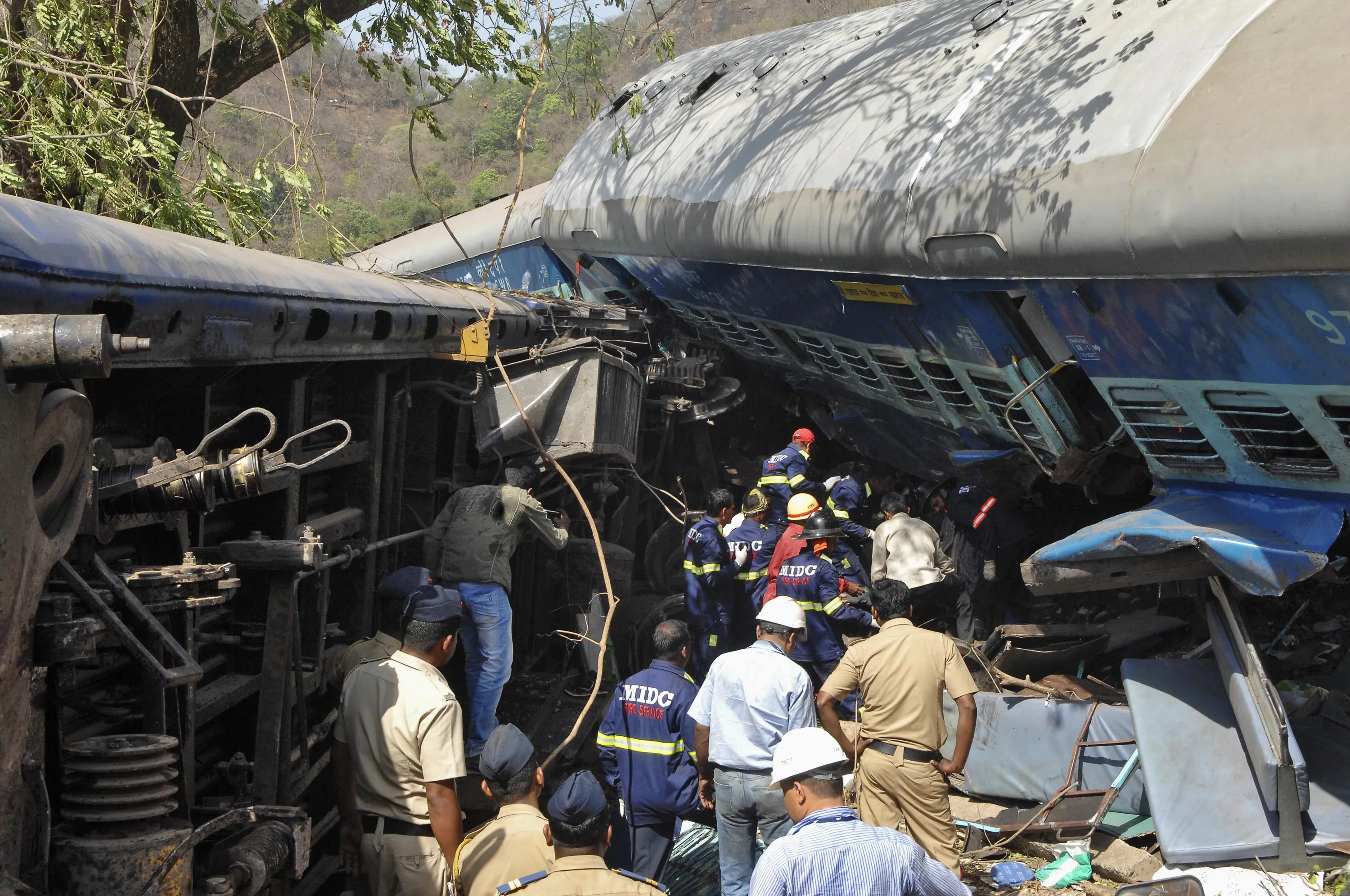 Rescuers search for survivors from the debris of a passenger train after it derailed near Nidi village in the western Indian state of Maharashtra May 4, 2014. At least 13 passengers were killed and 30 others injured when four bogies of a passenger train derailed near the village on Sunday, railway officials said. (Photo by Reuters)