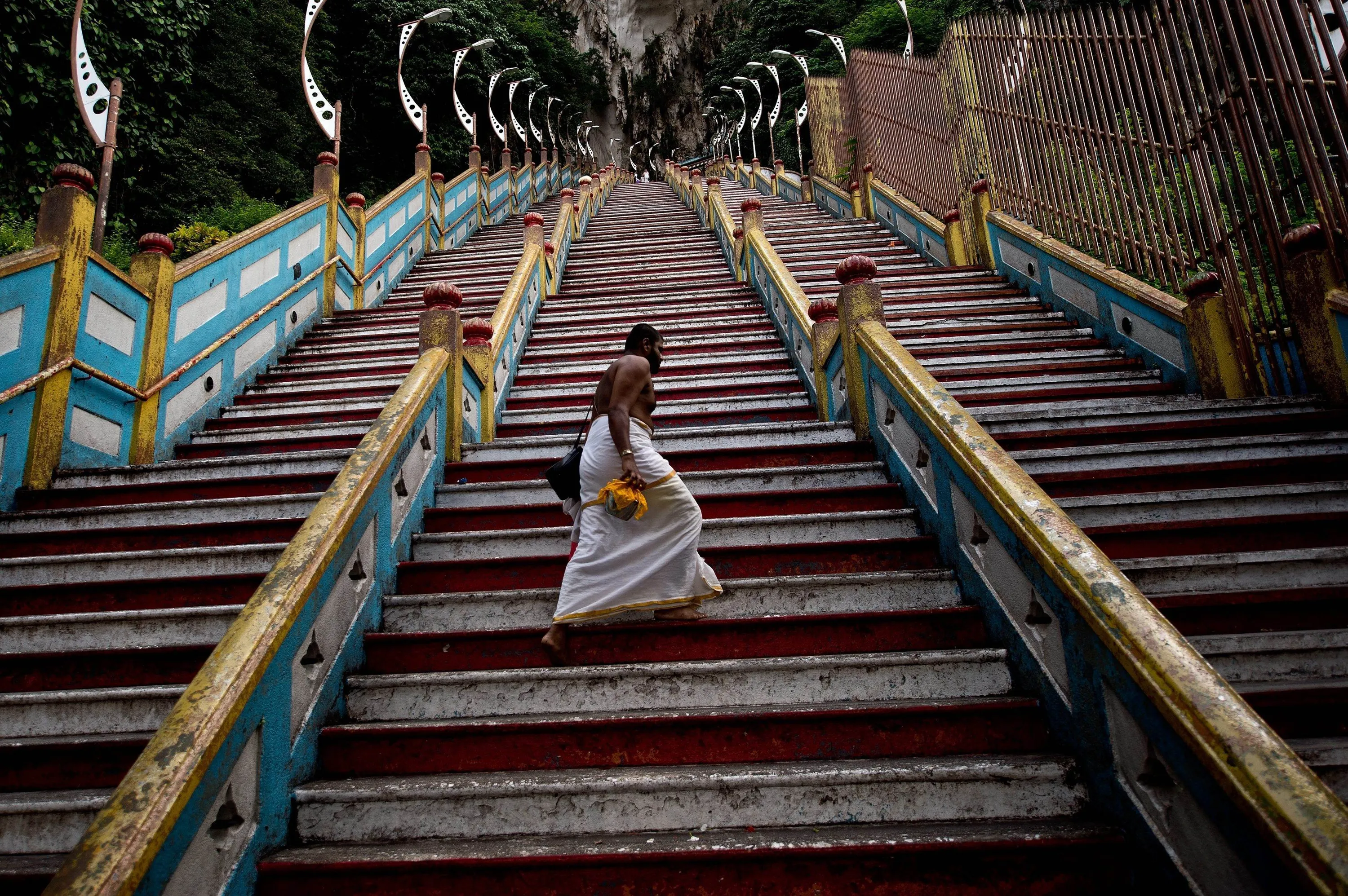 A Hindu priest walks up the 272 stairs to the Batu Caves temple outside of Kuala Lumpur on May 9, 2014. The temple built-inside centuries old limestone-formed Batu Caves, is one of the most popular Hindu shrines outside India, dedicated to Lord Murugan. (Photo by Manan Vatsyayana/AFP Photo)