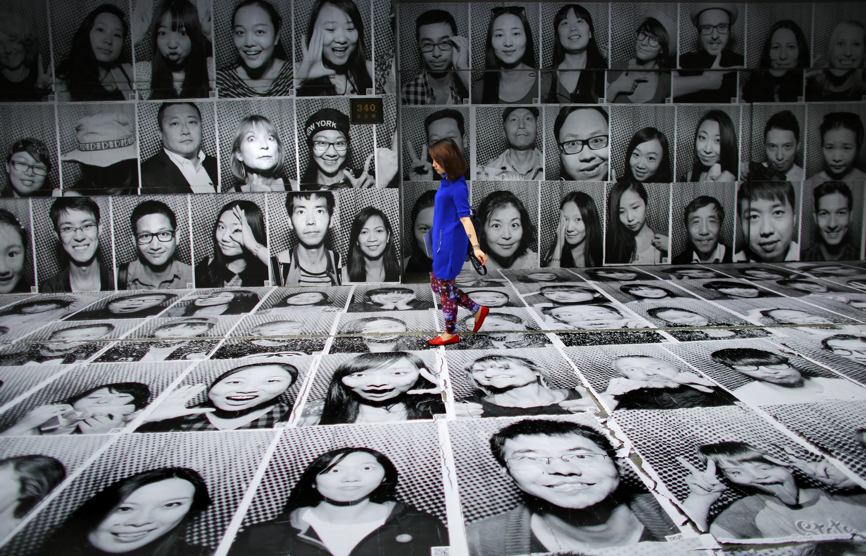 A woman walks through a display of portraits which were made as part of the Inside Out art project by French artist JR at Xintiandi area in downtown Shanghai May 14, 2014. JR and his team set up a photo studio and printing equipment in a truck to capture portraits of locals and tourists, which are then displayed in public. The portraits will be pasted on walls in the Lakeside Road area in Xintiandi. (Photo by Carlos Barria/Reuters)