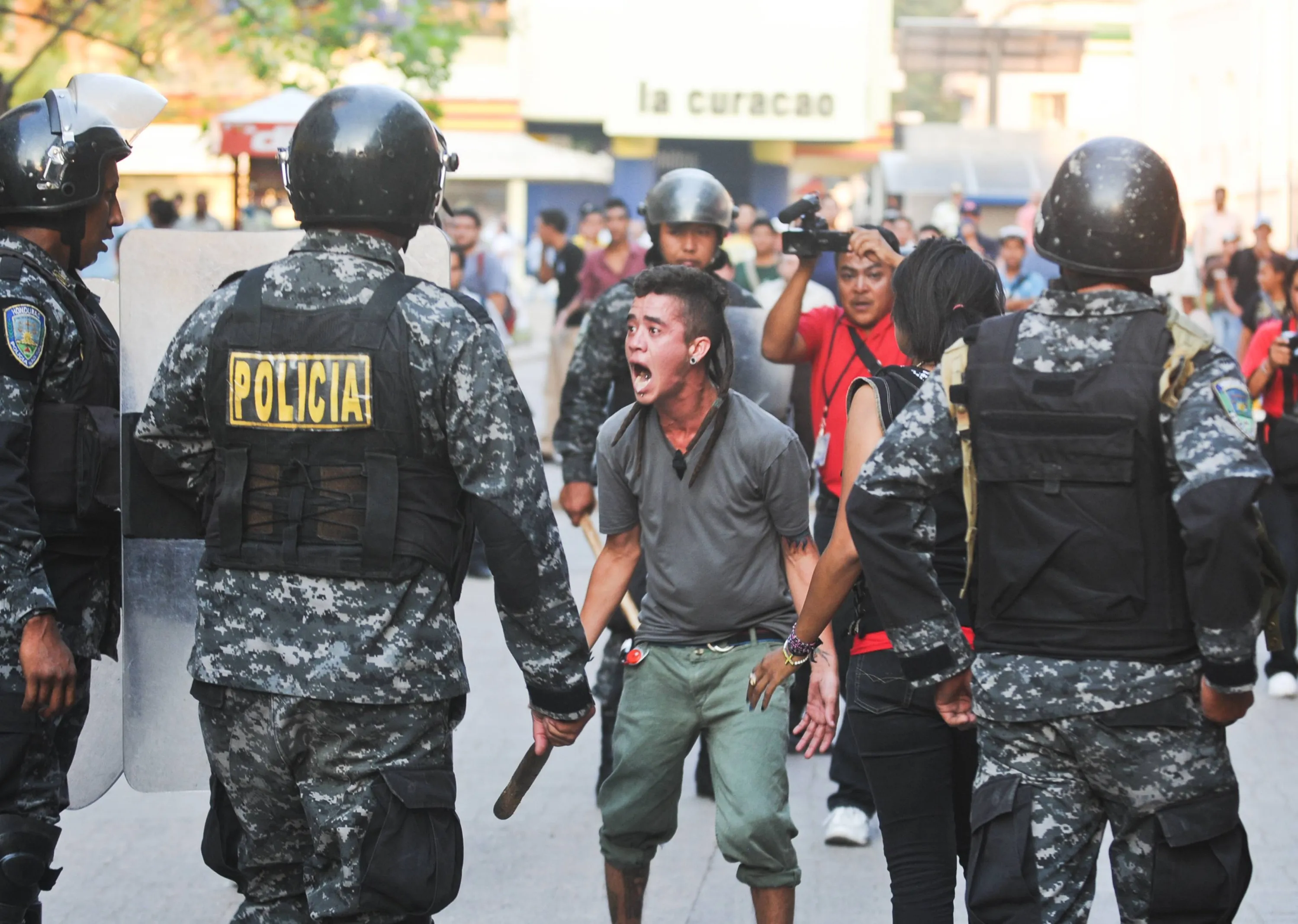 Supporters of the Libertad y Refundacion, LIBRE, political party, shout slogans against the Honduran government during a clashes with police, outside the congress building in Tegucigalpa, Honduras, Tuesday, May 13, 2014. Hundreds of supporters of former President and now Congressman, Manuel Zelaya, clashed with riot police and soldiers after occupying the National Congress building with him. They where eventually expelled violently from the building. (Photo by Fernando Antonio/AP Photo)