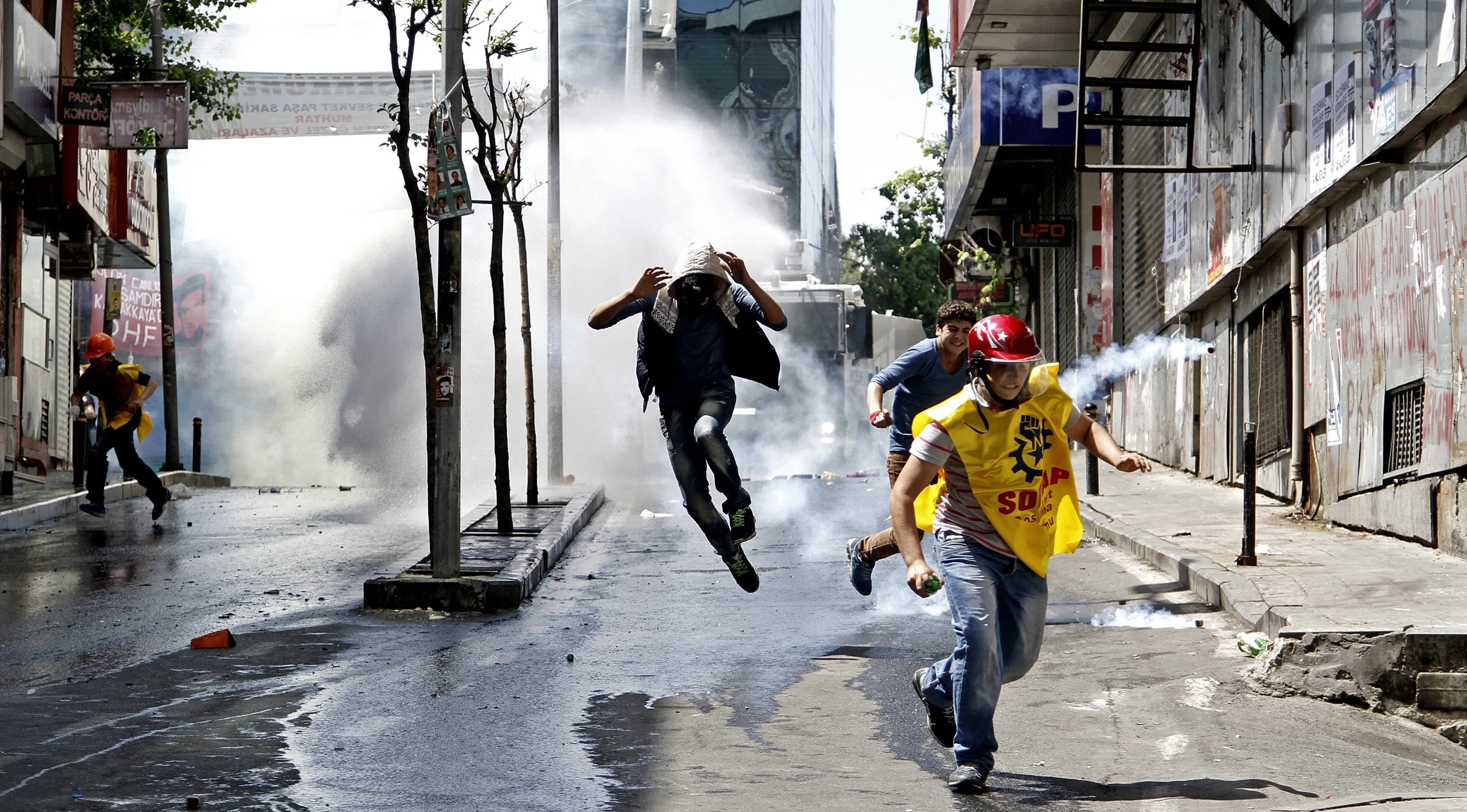 Protestors run away from tear gas used by Turkish riot police during a demonstration against the government in Istanbul, Turkey, 22 May 2014. A group of protestors see the Turkish government responsible for the Soma mine explosion. Prime Minister Recep Tayyip Erdogan's AKP reportedly rejected a motion by the centre-left People's Republican Party (CHP) in April to review safety at the Soma mine. The worst mining disaster in the country's history left at least 301 workers dead. (Photo by Ulas Yunus Tosun/EPA)