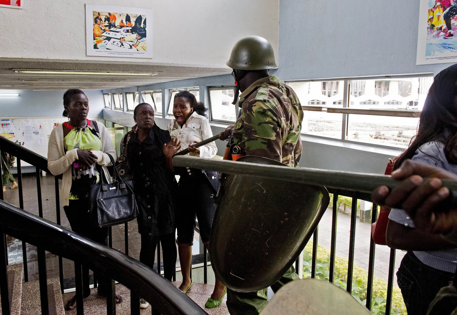 Kenyan riot police question students inside Nairobi University on May 20, 2014. The students were demonstrating against a controversial fee increment which ended in a riot with tear gas fired and riot police forcing their way inside the university to arrest students after rocks were thrown. (Photo by Carl de Souza/AFP Photo)