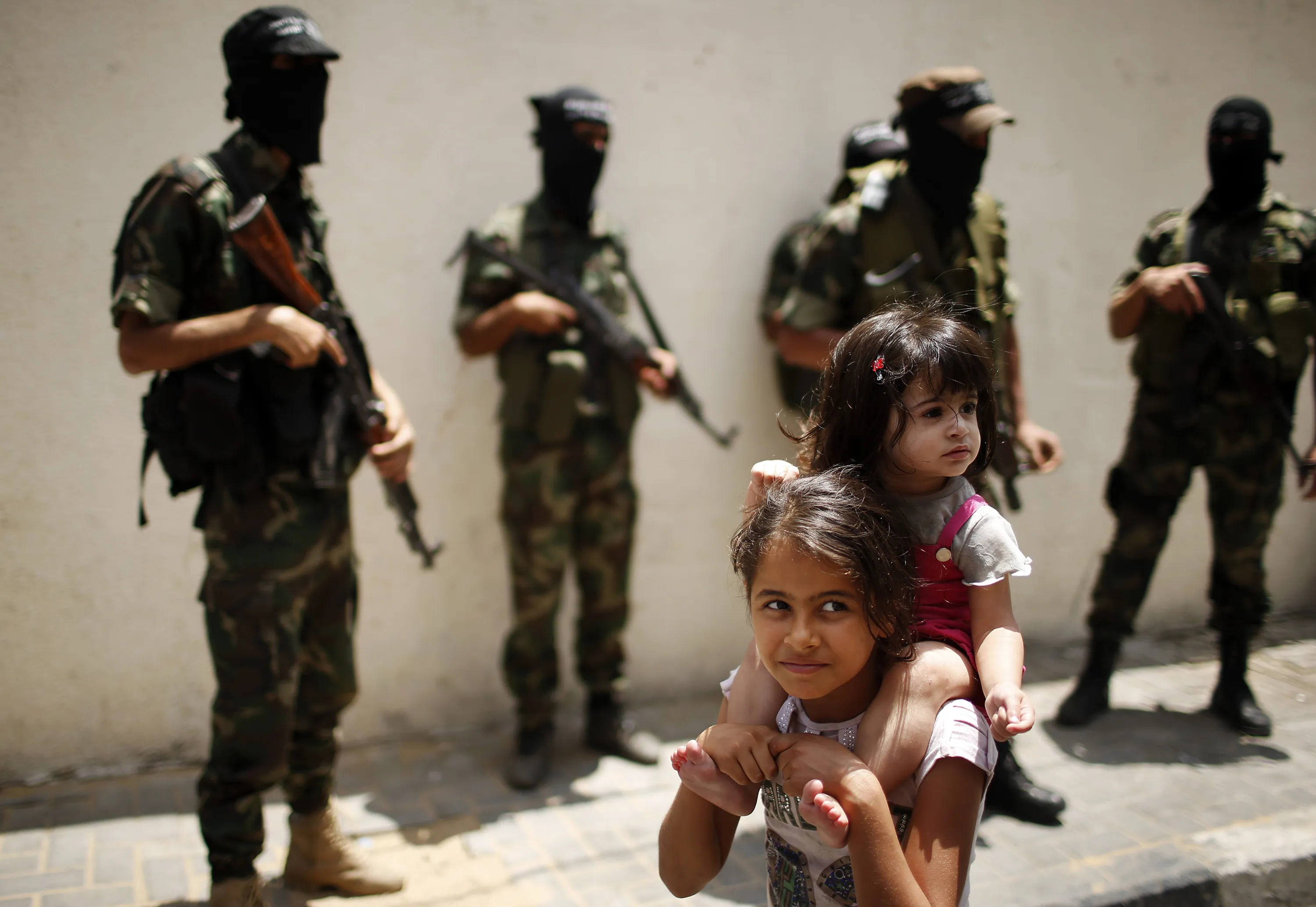 A Palestinian girl carries her sister as they pass militants during the funeral of militant Mohammed Al-Awor in Beit Lahiya in the northern Gaza Strip June 12, 2014. (Photo by Mohammed Salem/Reuters)