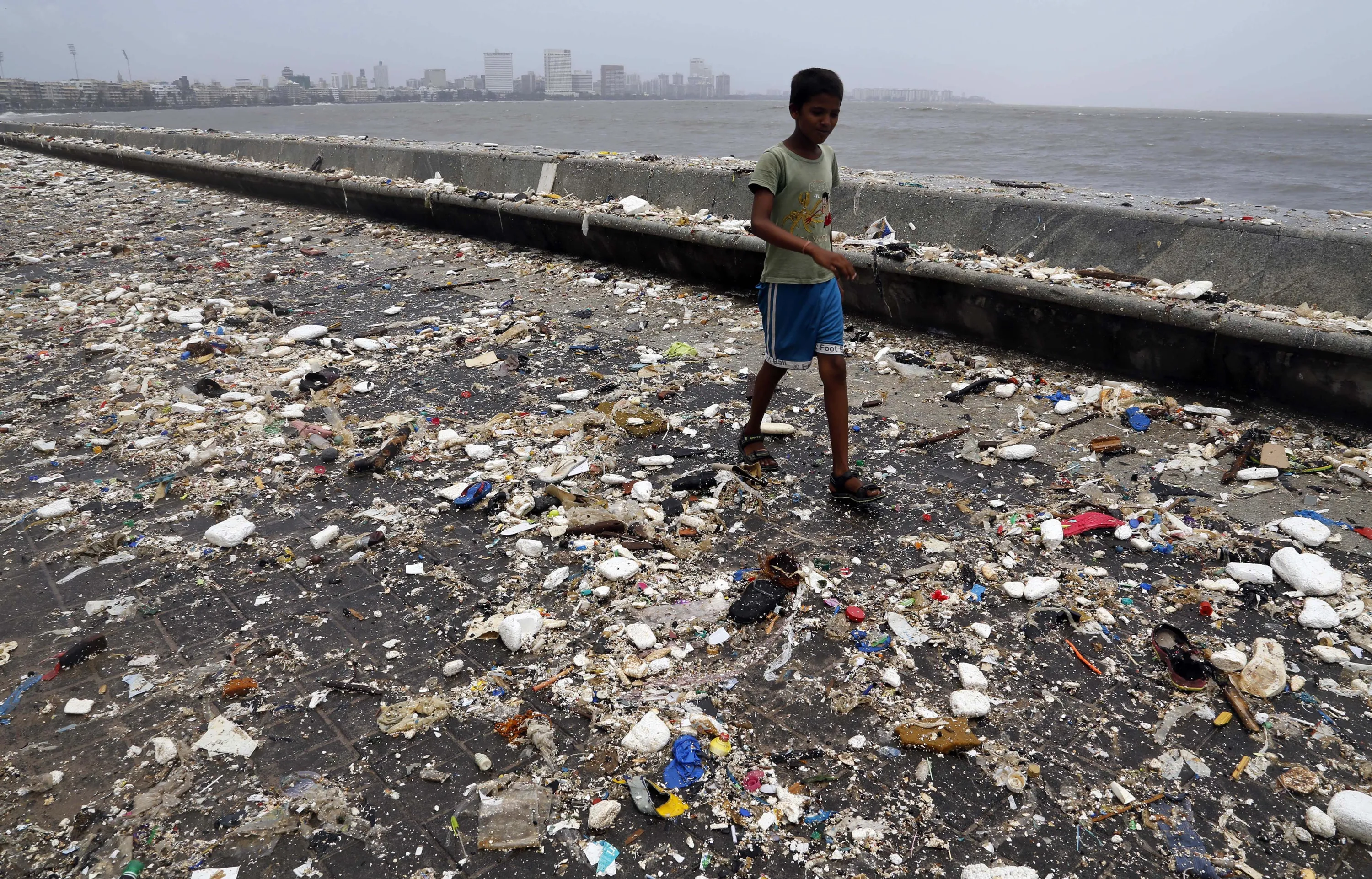 A boy walks through the Arabian Sea coast after tidal waves receded filling the shore with garbage in Mumbai, India, Thursday, June 12, 2014. (Photo by Rajanish Kakade/AP Photo)
