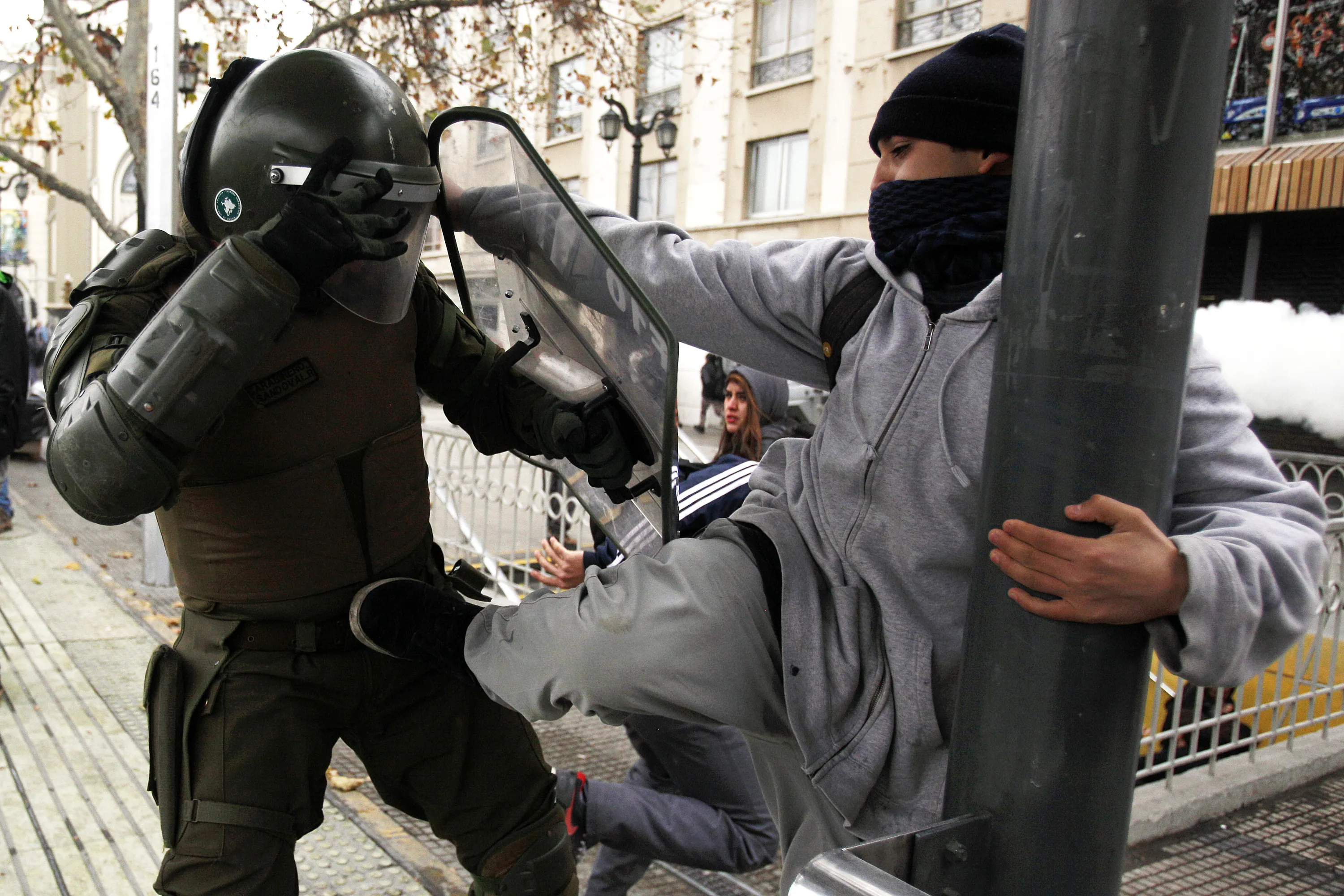A protester kicks a policeman during a student demonstration in Santiago, Chile, Tuesday, June 10, 2014. Tens of thousands of students protested in Chile demanding education reform since President Michelle Bachelet took power on promises of deep changes. (Photo by Luis Hidalgo/AP Photo)