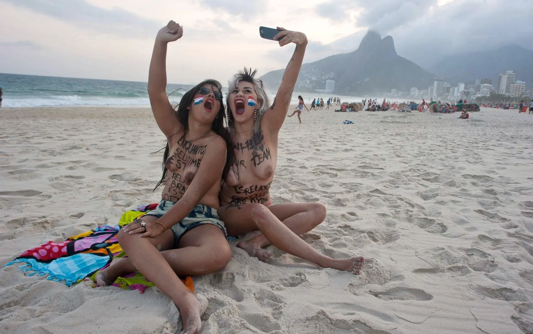 Feminist activists Bastardxs group, Sara Winter and Fernanda Frendoshy, half-naked protests against the World Cup, on Ipanema beach, near the Caesar Park Hotel, where the Dutch national soccer team is staying in Rio de Janeiro, on June 9, 2014. (Photo by Ilan Pellenberg/Agência O Dia/Estadão Conteúdo)