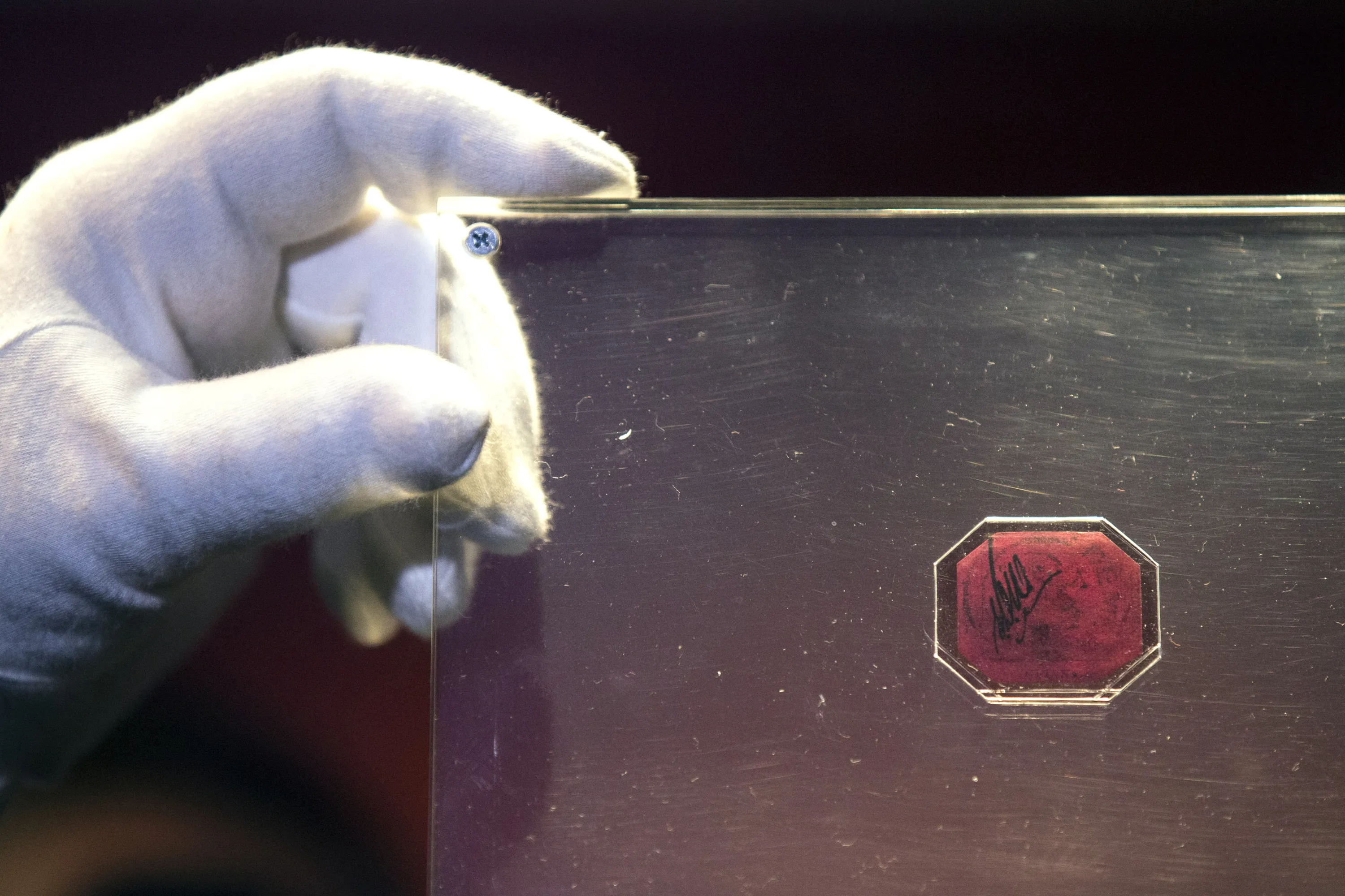 An employee of Sotheby's auction house holds a case containing the sole-surviving “British Guiana One-Cent Magenta” stamp dating from 1856, on June 2, 2014 in London, England. The unique stamp is expected to fetch 20 million USD when auctioned in New York, USA on June 17, 2014. The stamp was initially discovered in 1873 by a 12-year old Scottish boy living in British Guiana, South America who sold it to a local stamp collector for several shillings. (Photo by Oli Scarff/Getty Images)