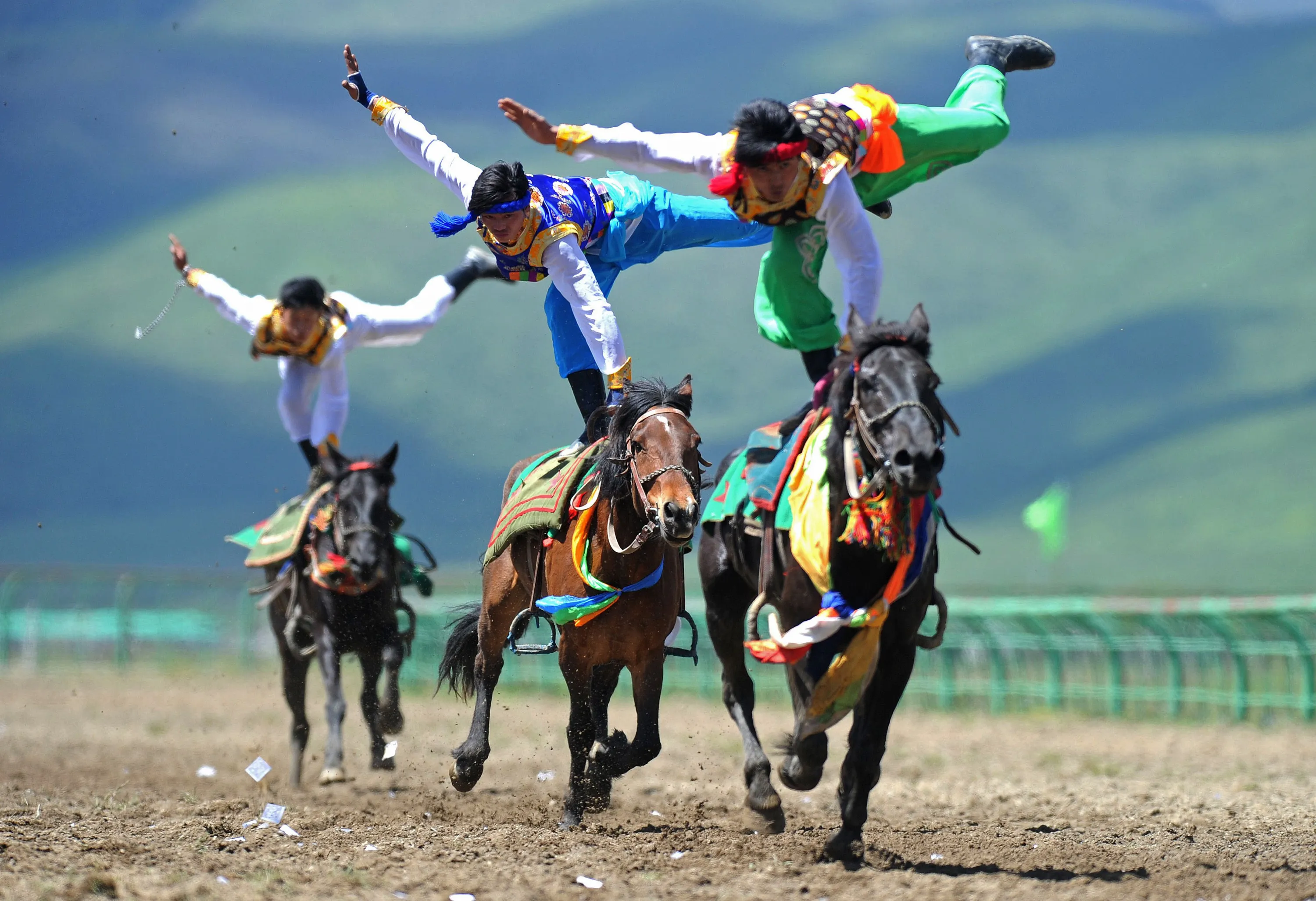 This picture taken on June 17, 2014 shows riders wearing ethnic group costume competing in a traditional horseback riding event in Hongyuan county of Aba town, or Ngawa town, southwest China's Sichuan province. Some 300 riders from 15 teams around the country took part in the traditional horseback riding event, local media reported. (Photo by AFP Photo)