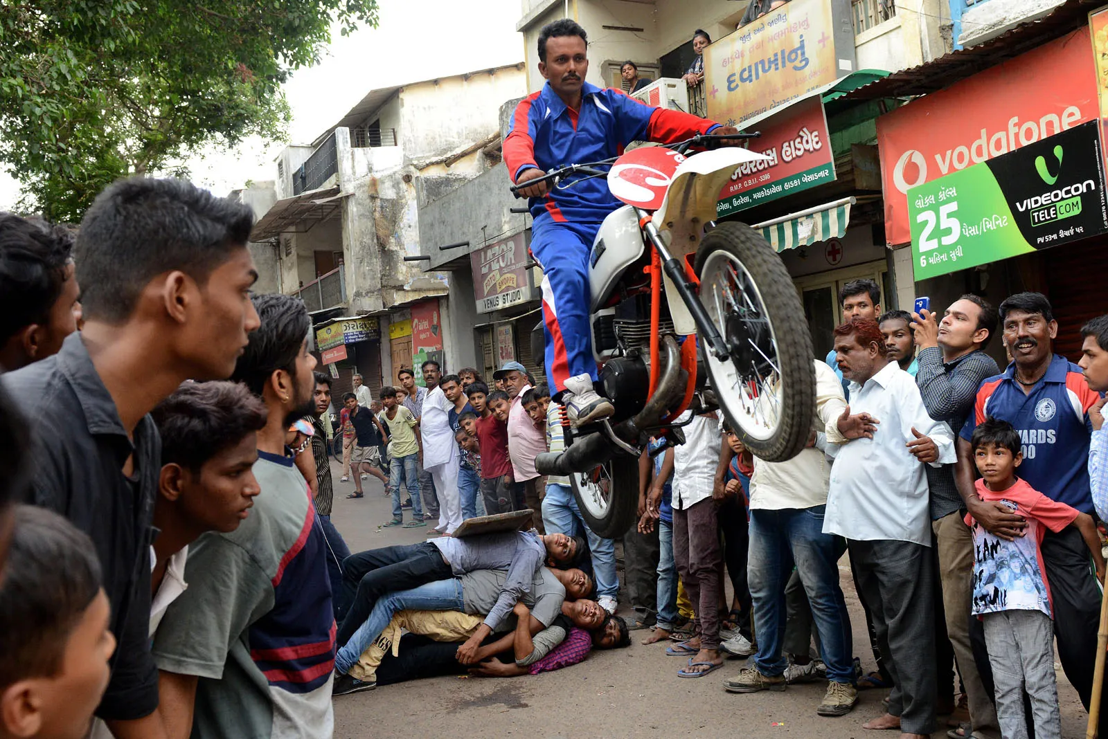 Indian man, Kalpesh Modi performs with his motorcycle as he rehearses for the forthcoming annual Lord Jagannath Rath Yatra in Ahmedabad on June 22, 2014. The 137th annual Lord Jagannath Rath Yatra in Ahmedabad is scheduled for June 29th. (Photo by Sam Panthaky/AFP Photo)