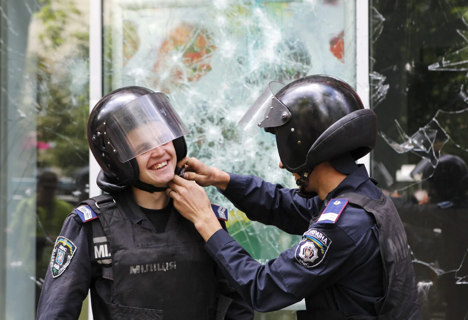 An Interior Ministry security force member assists his colleague to adjust the helmet as they stand guard outside a branch of Russian bank Sberbank which was attacked during a pro-Ukrainian anti-separatist rally in Kiev, June 22, 2014. (Photo by Valentyn Ogirenko/Reuters)