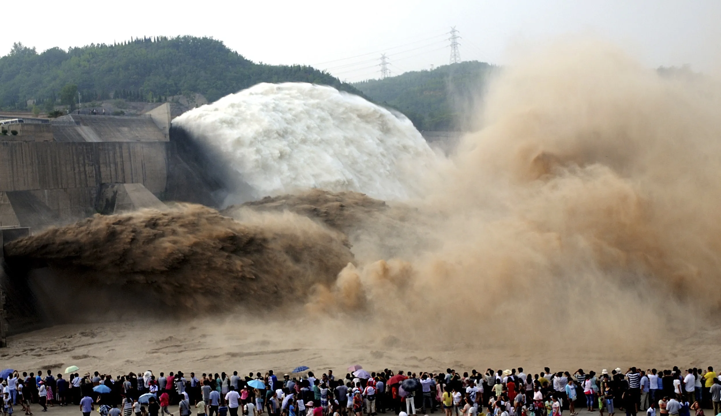 People look on as water gushes from the Xiaolangdi Reservoir section on the Yellow River, during a sand-washing operation in Jiyuan, Henan province July 5, 2014. (Photo by Reuters/Stringer)