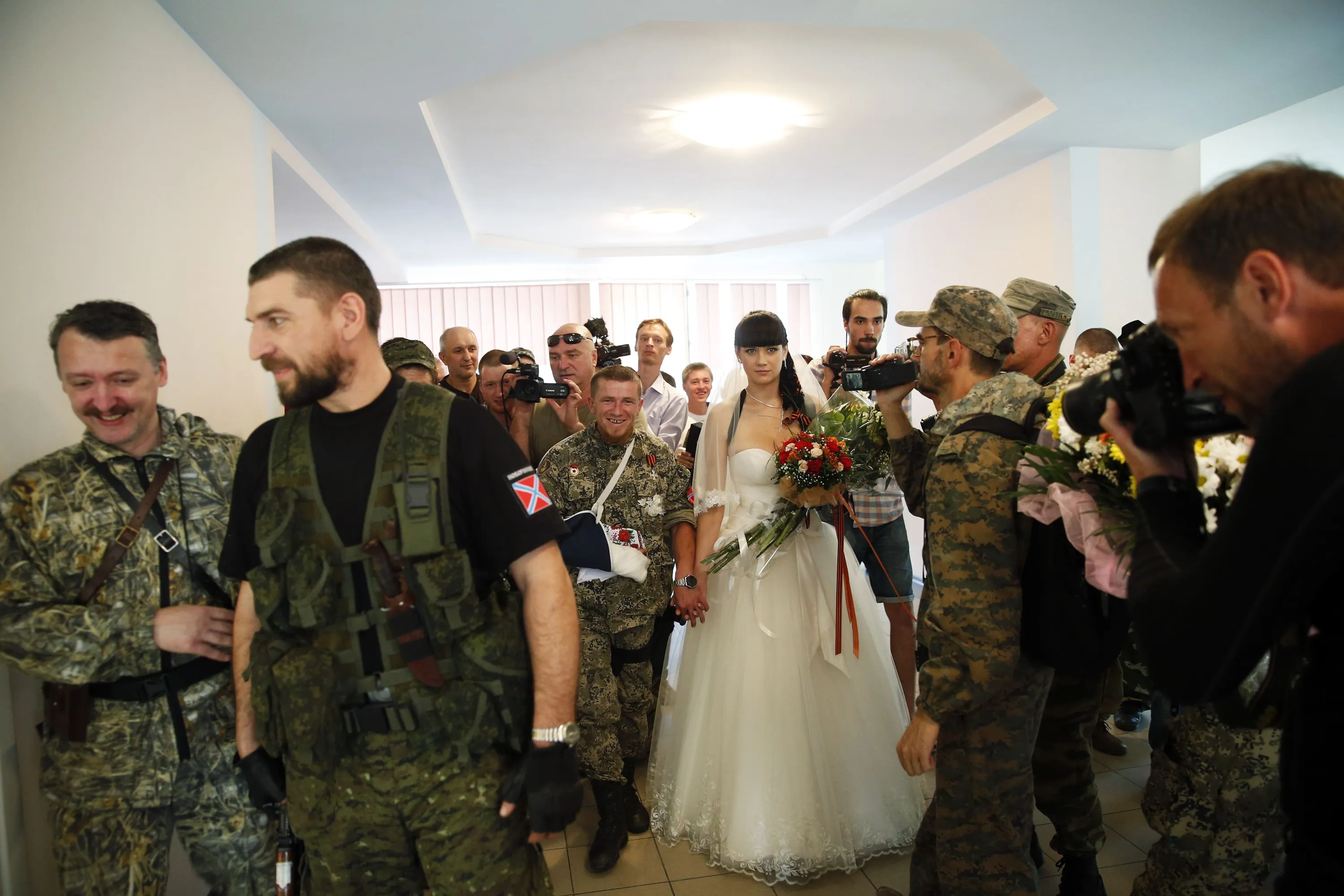 Pro-Russian separatist Arsene Pavlov, call sign “Motorola”, and his bride Elena walk surrounded by fellow separatists during a marriage ceremony in the registry office of the city of Donetsk July 11, 2014. (Photo by Maxim Zmeyev/Reuters)