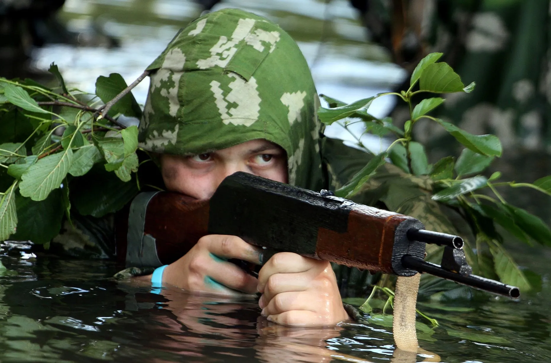 Wearing Soviet-era fatigues a teenager aims his wooden Kalashnikov chin deep in water as he takes part in a military game simulating special operations at their “Spetsnaz” (Special Forces) military adventure training camp near the Belarus village of Talka, some 90 km southeast of the capital Minsk, on July 6, 2014. (Photo by Sergei Gapon/AFP Photo)