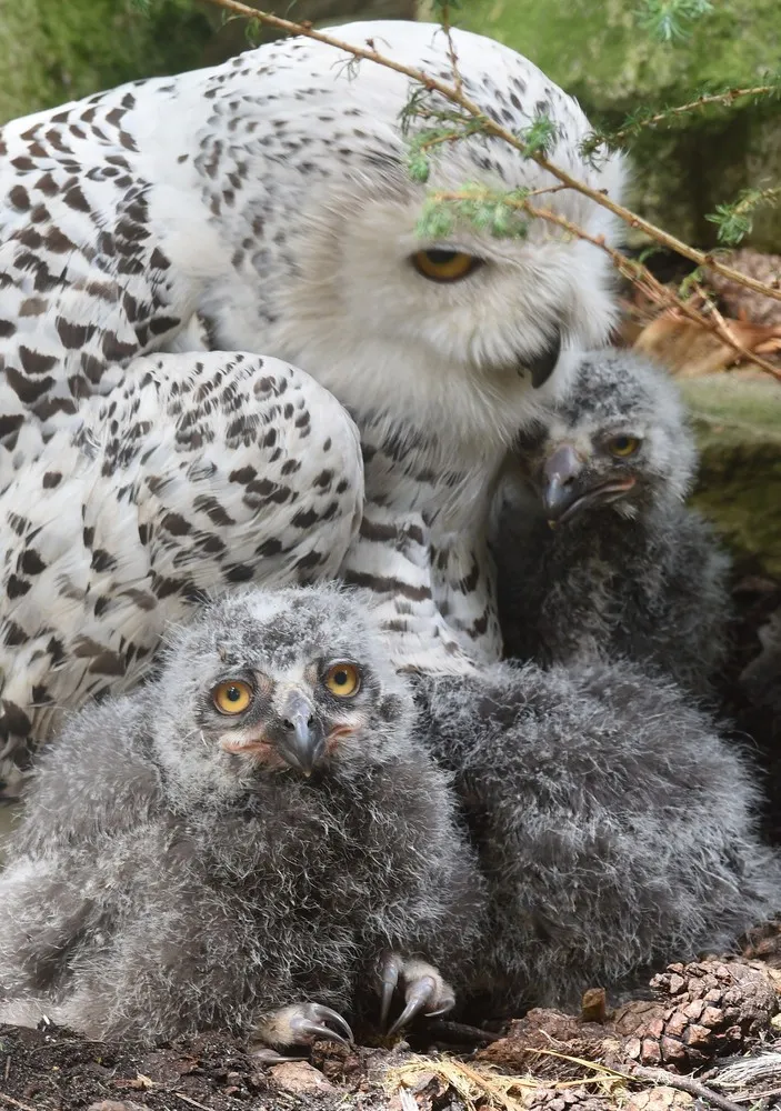 Ten days old snowy owls are protected by the mother on July 7, 2014 in Walsrode Bird Park, Germany. (Photo by Holger Hollemann/AFP Photo/DPA)