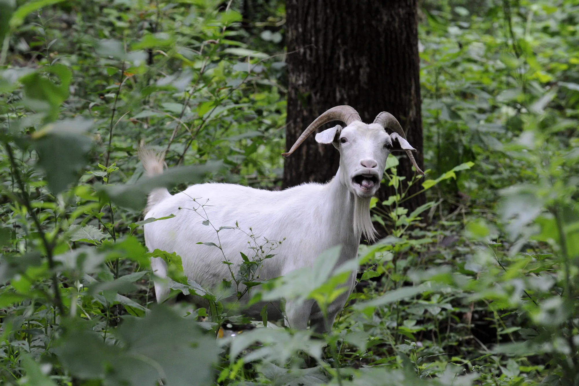 A goat released by Richard Gibbs quickly moves deep into the Williams Creek Urban Forest to chow down on invasive weeds and grasses in Knoxville, Tenn., Thursday, July 10, 2014. The goats were leased from Whistlepig Farms in Thornhill by the Tennessee Clean Water Network to clear the underbrush. (Photo by Michael Patrick/AP Photo/Knoxville News Sentinel)