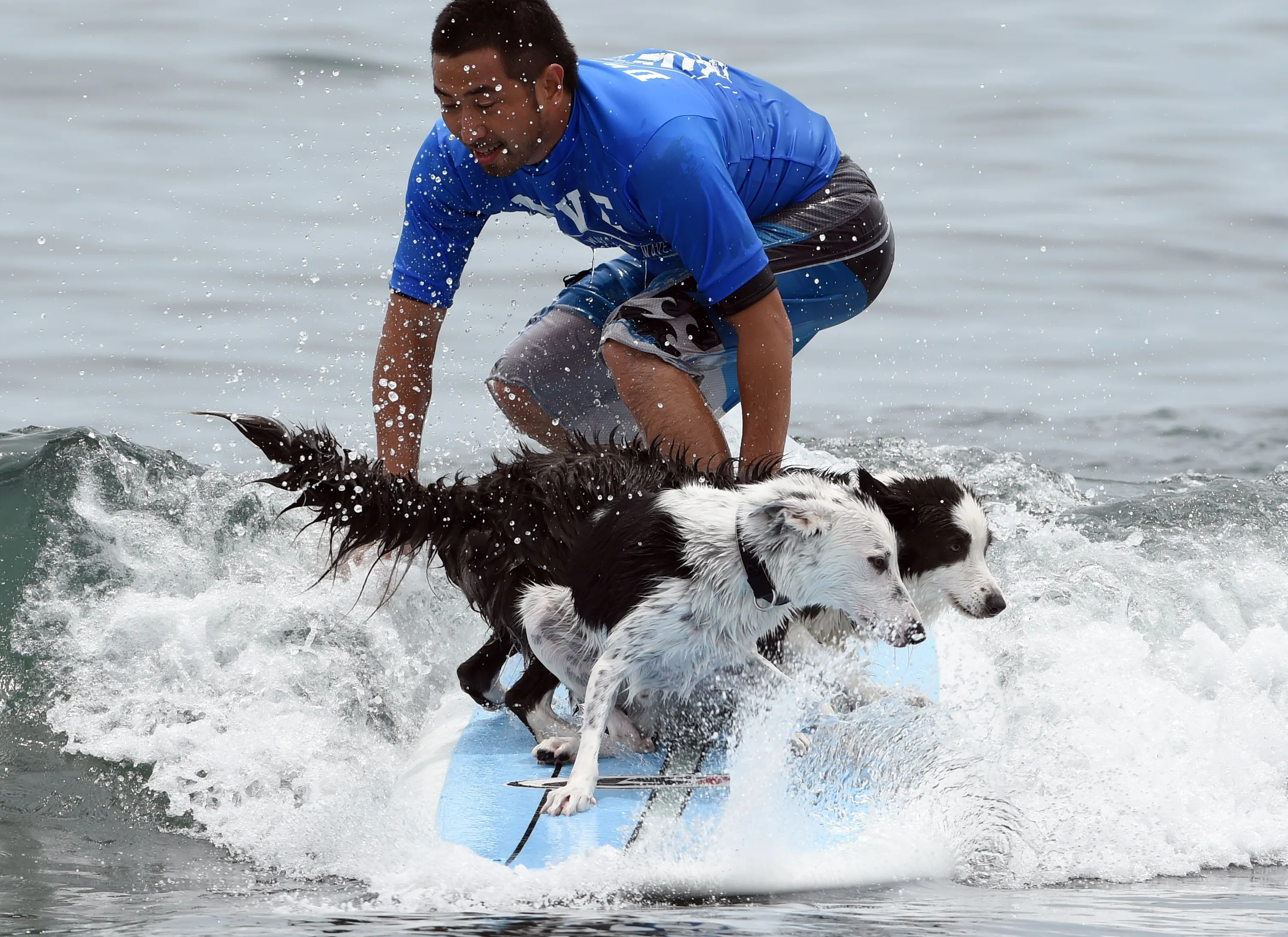 Roa (front L) and Vivi (front R) and owner Daisuke Nonaka ride on a wave during the animal surfing portion of the Mabo Royal Kj Cup surfing contest at Tsujido beach in Fujisawa, Kanagawa prefecture on July 6, 2014. (Photo by Toshifumi Kitamura/AFP Photo)