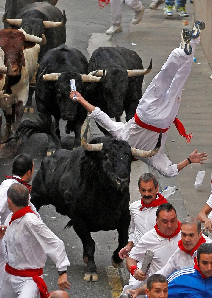 In this photo taken Thursday, July 10, 2014, Fernando Echaburu of Spain is tossed in the air by a fighting bull from the Garcigrande ranch after being gored in the leg during a running of the bulls at the San Fermin festival in Pamplona, Spain. (Photo by Diario de Navarra/AP Photo/Javier Sesma)