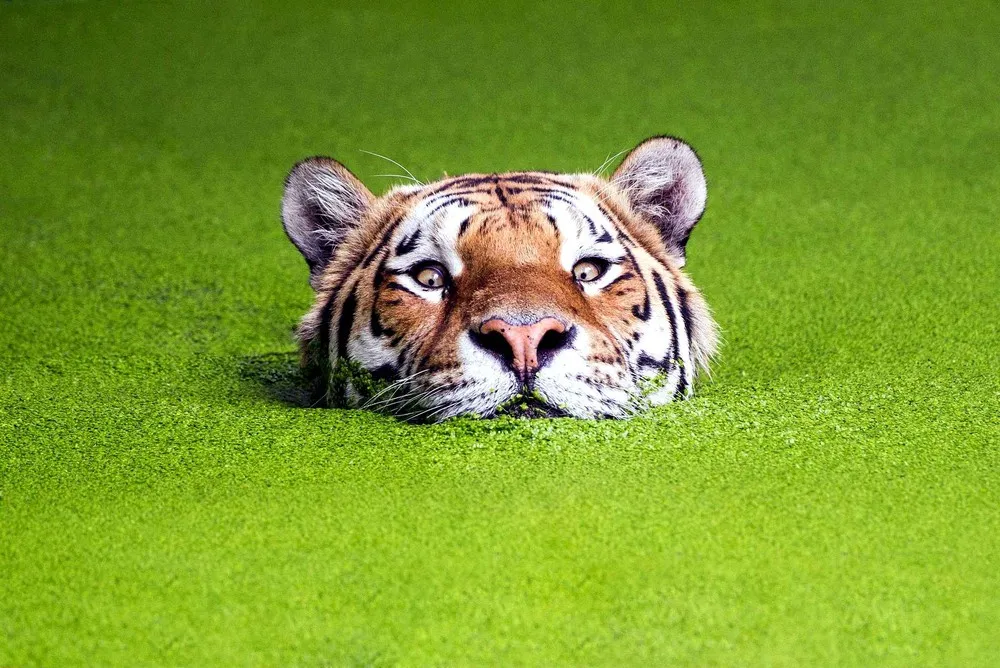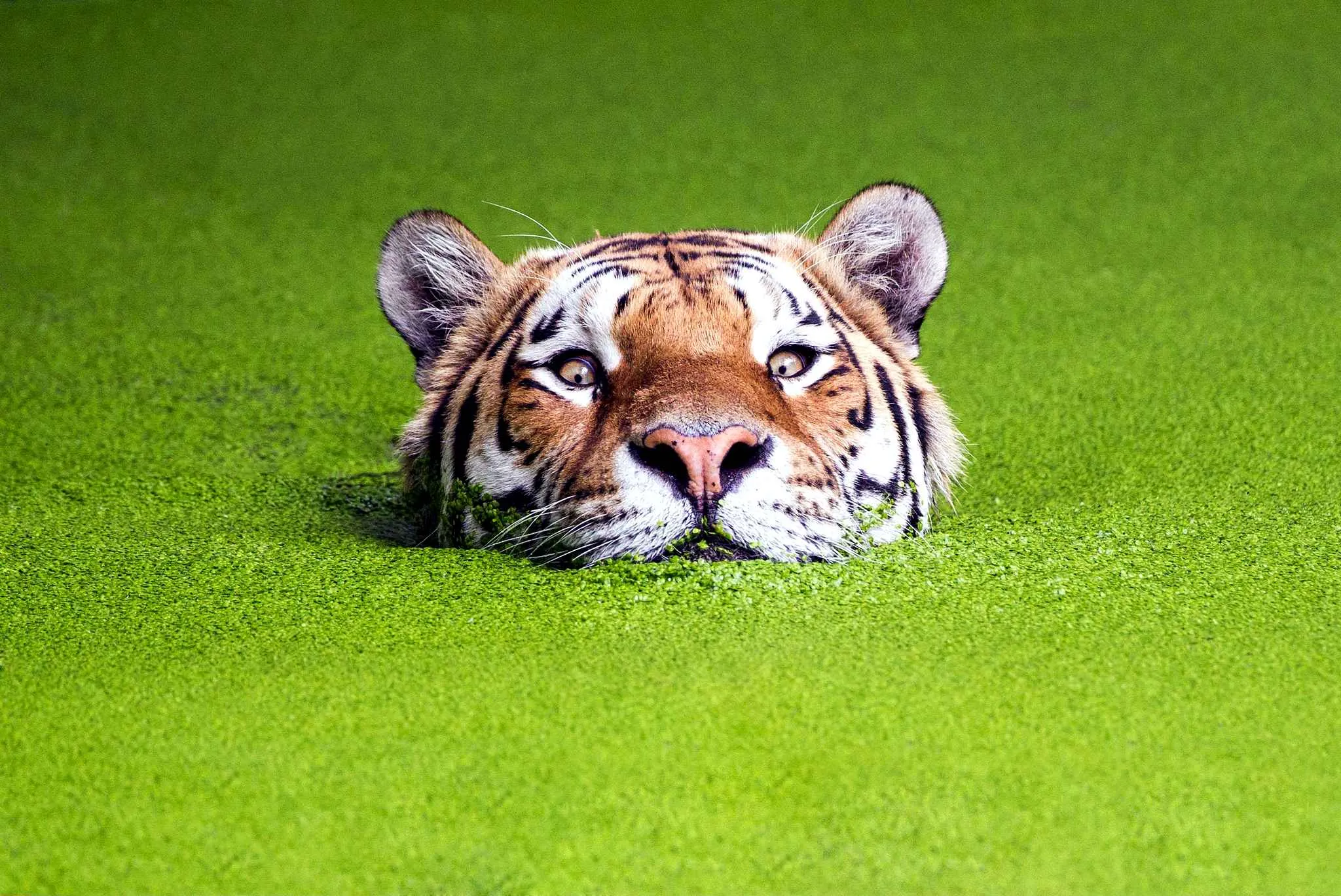 These stunning pictures show a normally vicious tiger calmly swimming in a pool of algae, on Jule 9, 2014. The powerful cat takes a refreshing break by taking a dip in the bright green algae. But it looks like this big cat is scared of getting his head wet as he strains to keep it above the water. After splashing around for a bit the tiger gets out and tries to air-dry with specks of the vegetation dripping off his fur. The striking pictures were taken at Copenhagen zoo by snapper Soren Lundgren Neilson. (Photo by Soren Nielsen/Caters News)