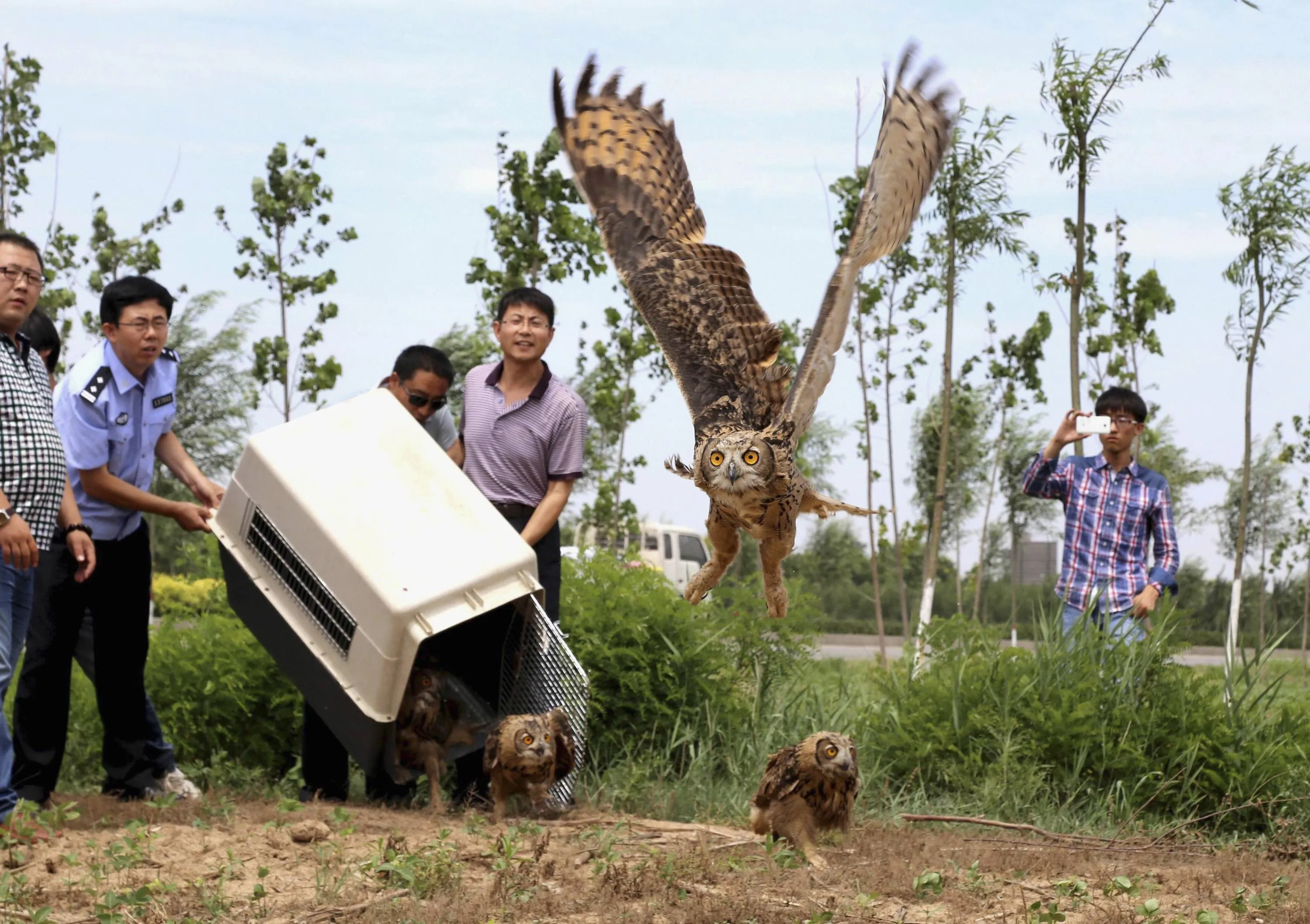 Policemen and volunteers release eagle owls after their recovery from injury, in Cangzhou, Hebei province, China, on Jule 10, 2014. About 36 of these rare birds were sent back to the wild after receiving treatment for their injuries, according to local media. (Photo by Reuters/China Daily)