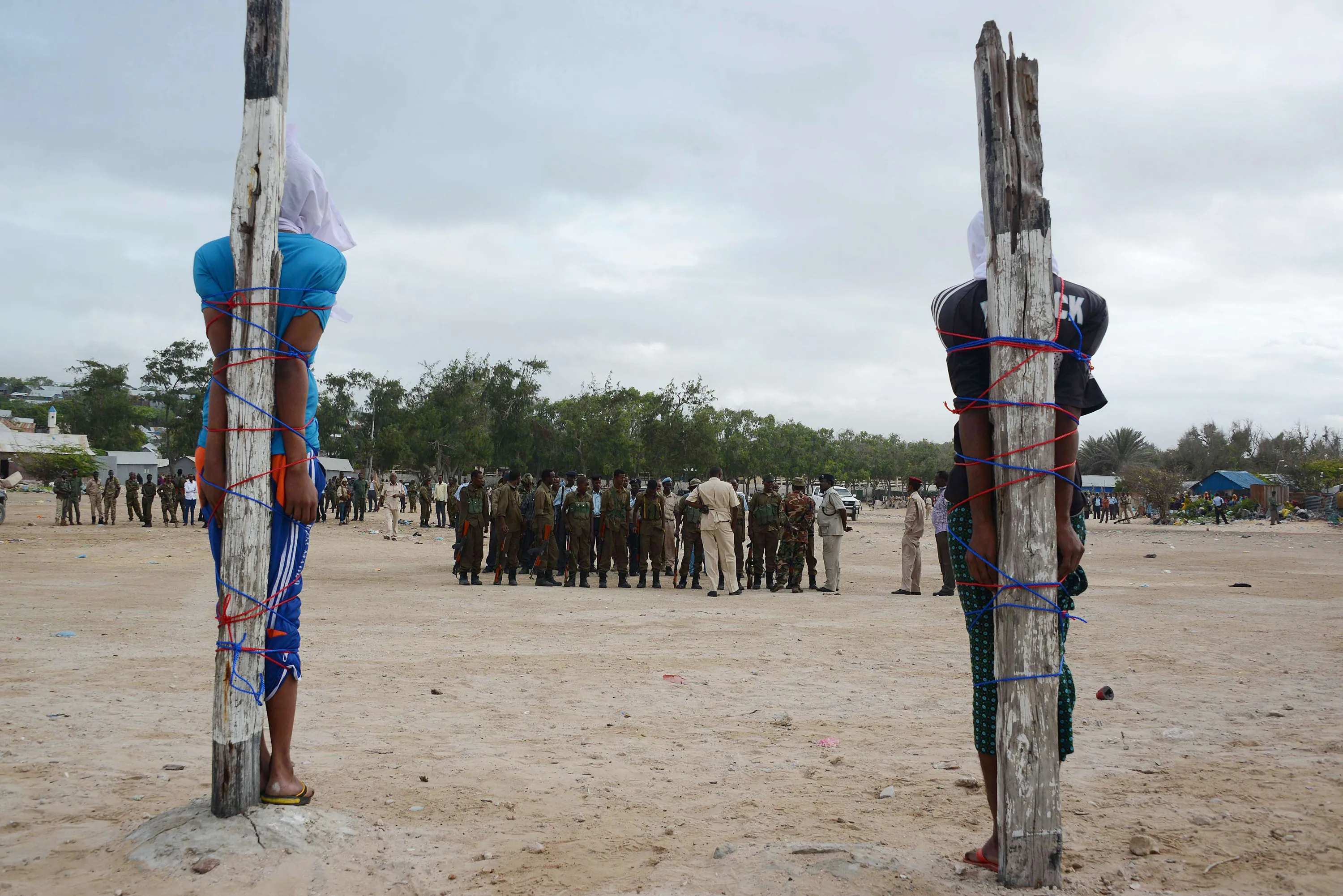 Two Somalis, convicted of the murder of a Somali nurse working with a Turkish medical aid unit, are tied to large wooden stakes as they wait to be executed by a firing squad on July 15, 2014 in Mogadishu. (Photo by Mohamed Abdiwahab/AFP Photo)