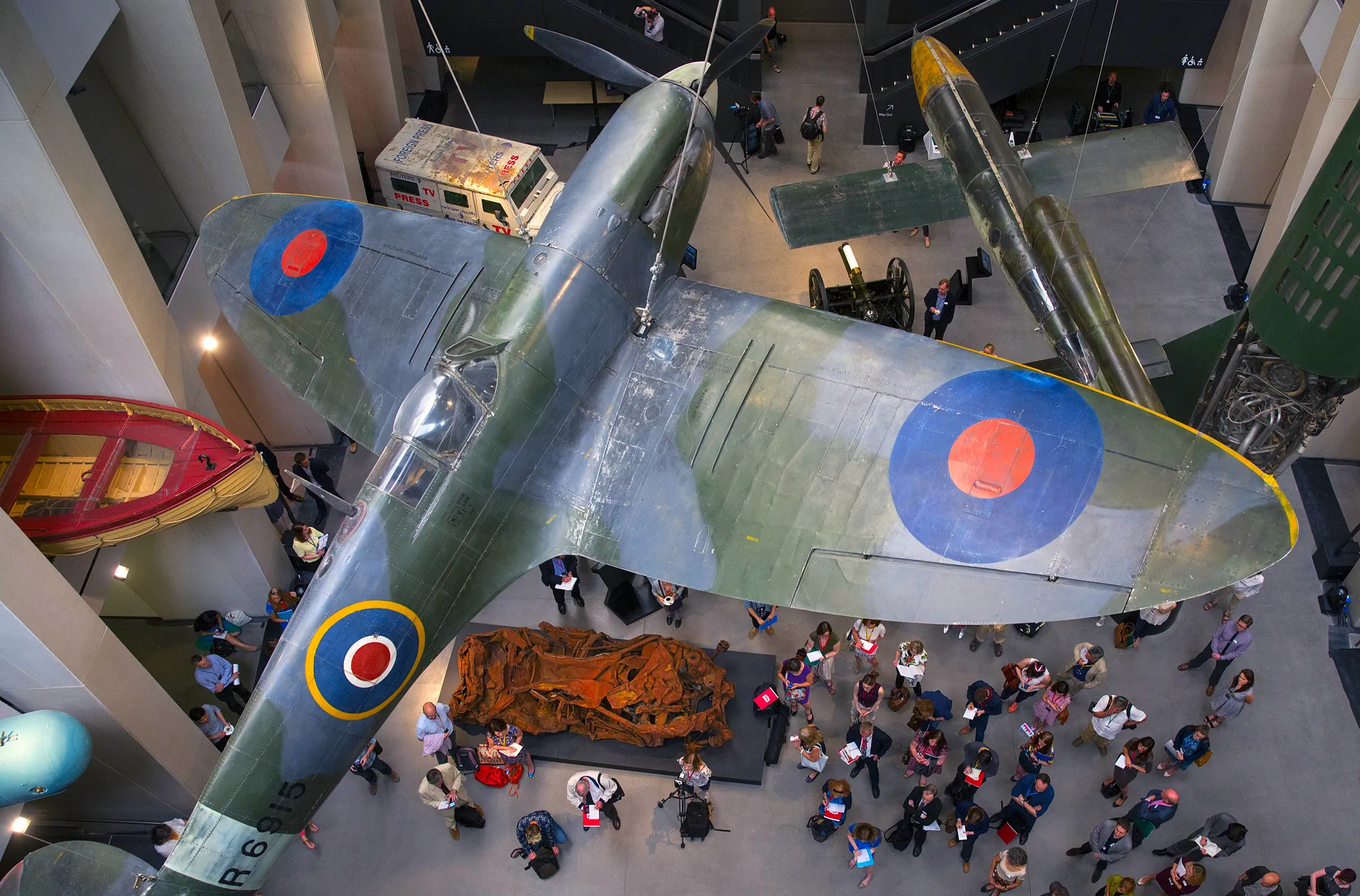 A general view of the main atrium at the Imperial War Museum on July 16, 2014 in London, England. The new World War One galleries at the Imperial War Museum are due to open on July 16, 2014 after a 40 million GBP refurbishment. The galleries will tell the story of the First World War, how it started, why it continued and its global impact. The exhibition features iconic objects including a Harrier jet, a Spitfire and a V2 rocket. (Photo by Oli Scarff/Getty Images)