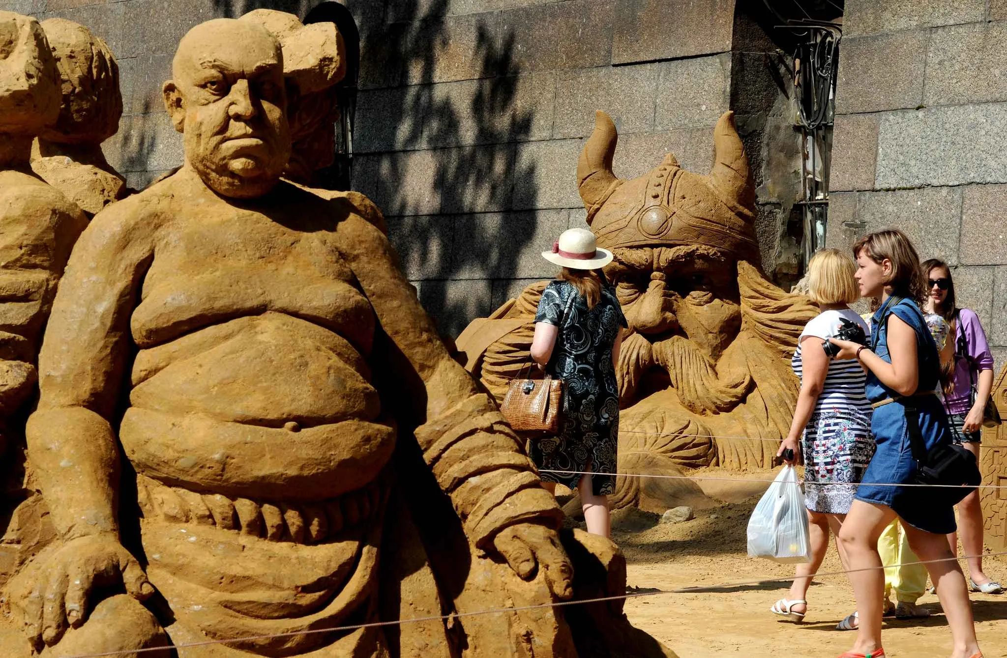 Visitors walk past sand sculptures displayed during the 13th International Festival of sand sculptures World of fairy tales in the Peter and Paul Fortress in St.Petersburg on July 17, 2014. (Photo by Olga Maltseva/AFP Photo)
