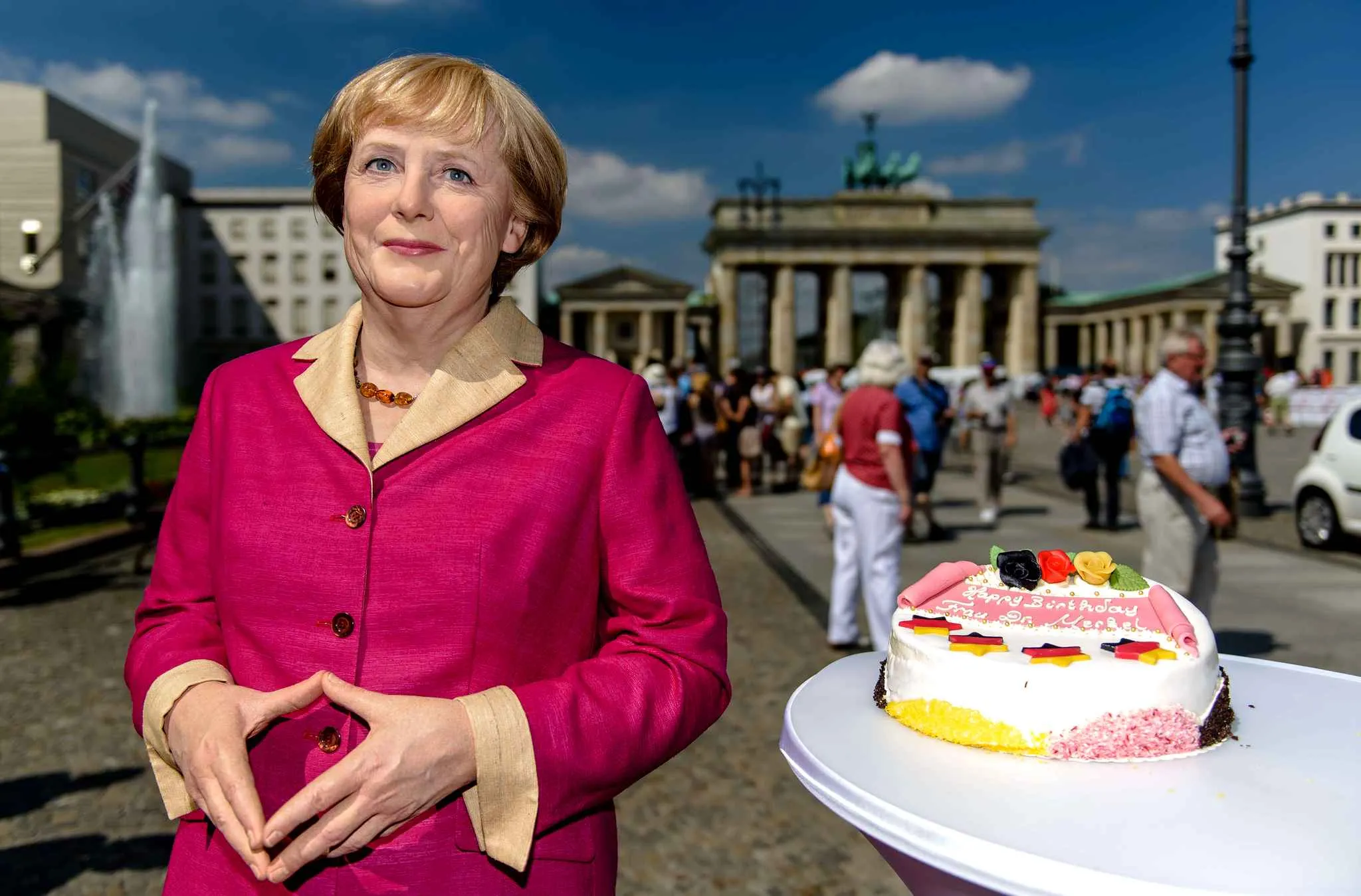 A wax likeness of German Chancellor Angela Merkel is pictured in front of the Brandenburg Gate in Berlin on July 16, 2014, on the occassion of Merkel's 60th birthday on July 17. (Photo by Clemens Bilan/AFP Photo)