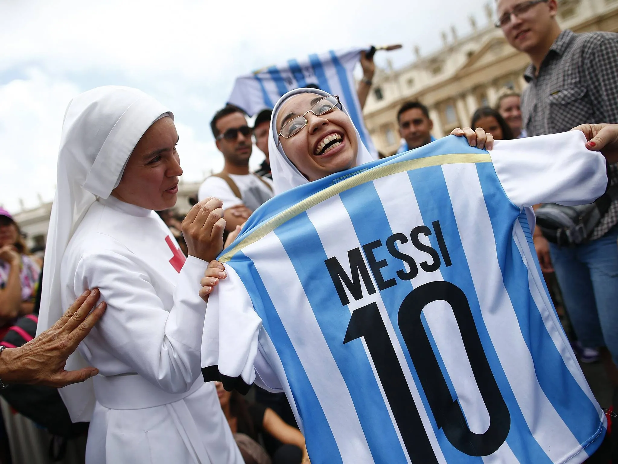 A nun holds an Argentinian national soccer team jersey as she waits for Pope Francis' Sunday Angelus prayer in Saint Peter's square at the Vatican, on Jule 13, 2014. (Photo by Tony Gentile/Reuters)