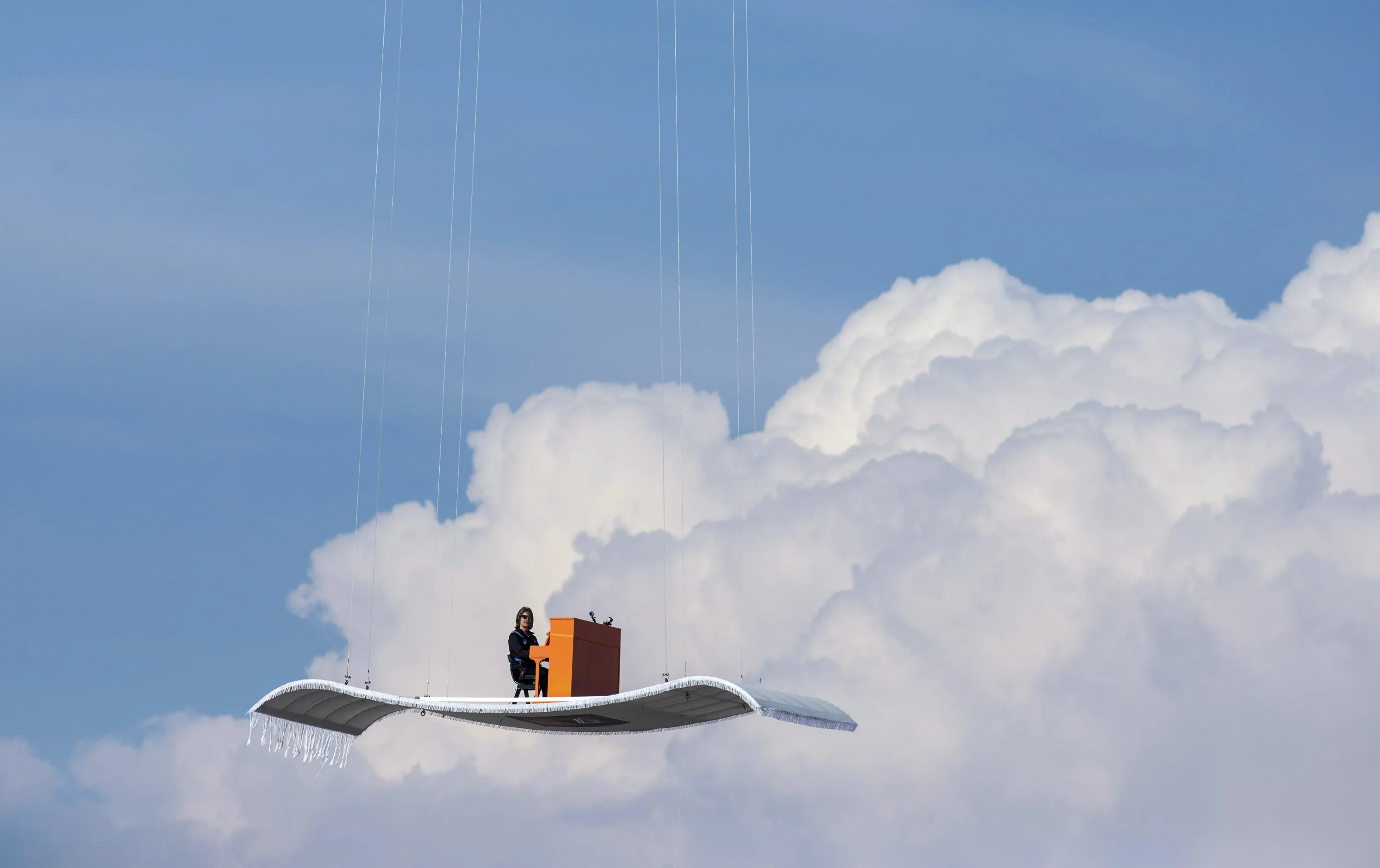 German pianist Stefan Aaron plays an orange piano on a “flying carpet” platform suspended from a helicopter, over the Munich airport July 23, 2014. The concert is the fourth station of the “Orange Piano Tour”, which brings the artist to places around the world. (Photo by Lukas Barth/Reuters)