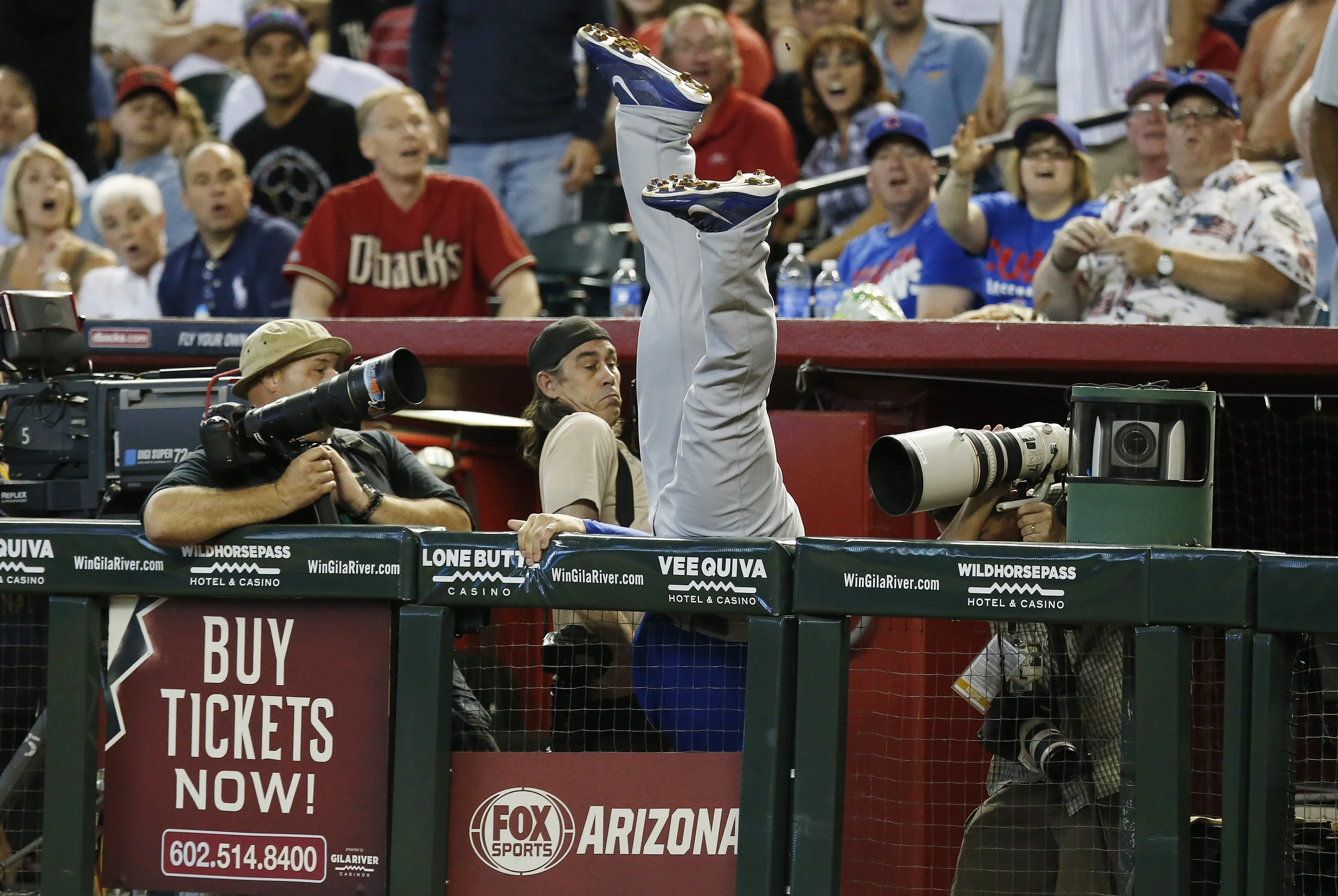 Photographers try to avoid Chicago Cubs' Anthony Rizzo, after he made a diving catch into the photo well, on a foul ball hit by Arizona Diamondbacks' Aaron Hill during the sixth inning of a baseball game on Sunday, July 20, 2014, in Phoenix. (Photo by Ross D. Franklin/AP Photo)