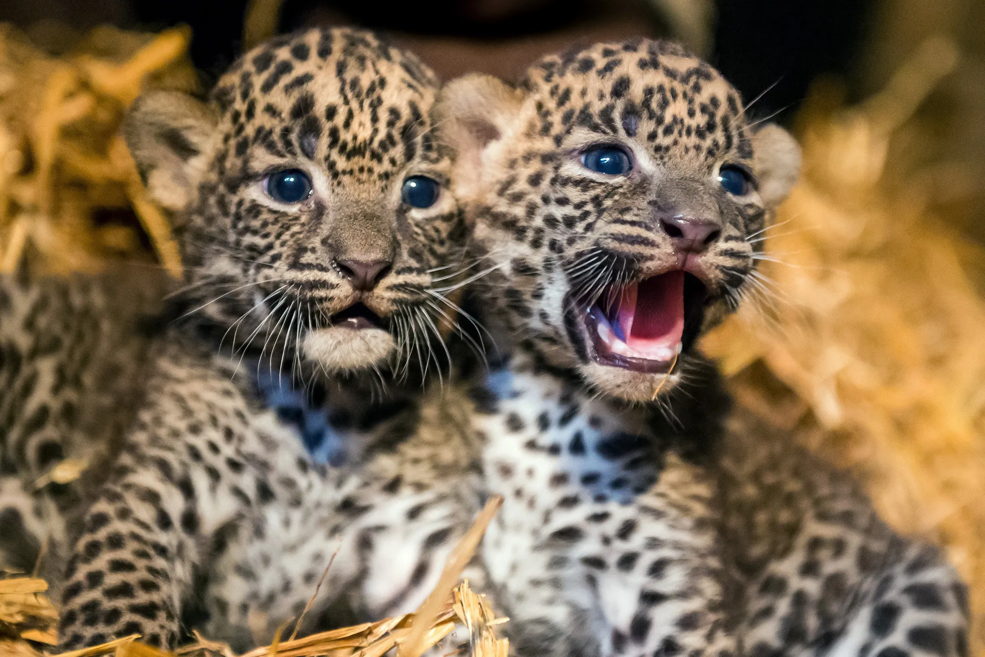 Two female Sri Lankan leopard cubs, born on July 1, 2014, sit their cage in the zoo of Maubeuge, northern France, on July 29, 2014. The Sri Lankan leopard is a threatened species, with an estimated 700 living in the wild and 65 in captivity. (Photo by Philippe Huguen/AFP Photo)