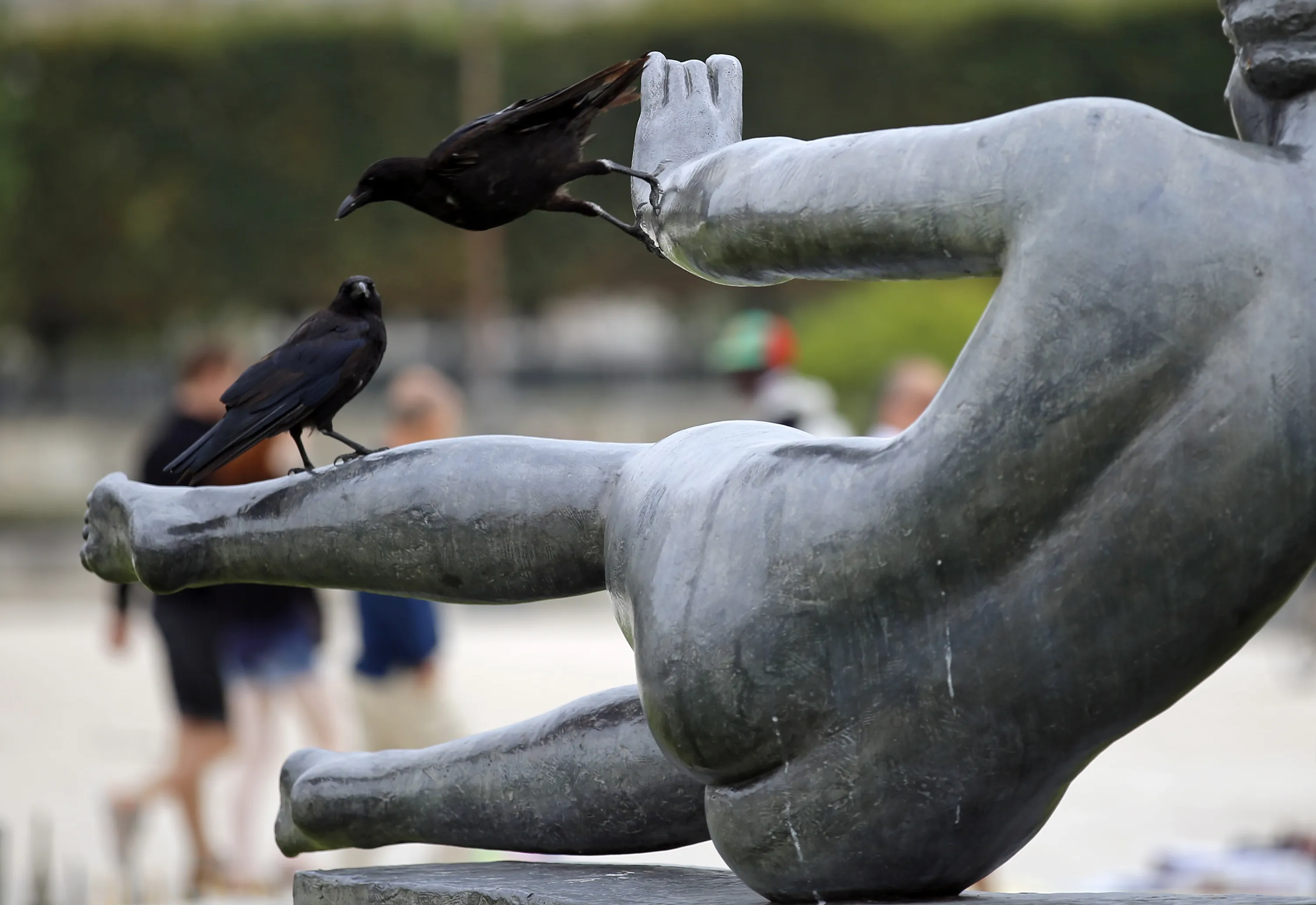 A black crow takes off as another looks on a 1932 lead statue named “Air” by French artist Aristide Maillol 1861-1944 in The Tuileries gardens of the Louvre Museum in Paris, France, Tuesday, July 29, 2014. (Photo by Francois Mori/AP Photo)